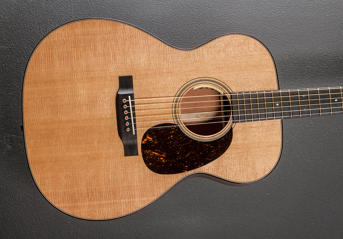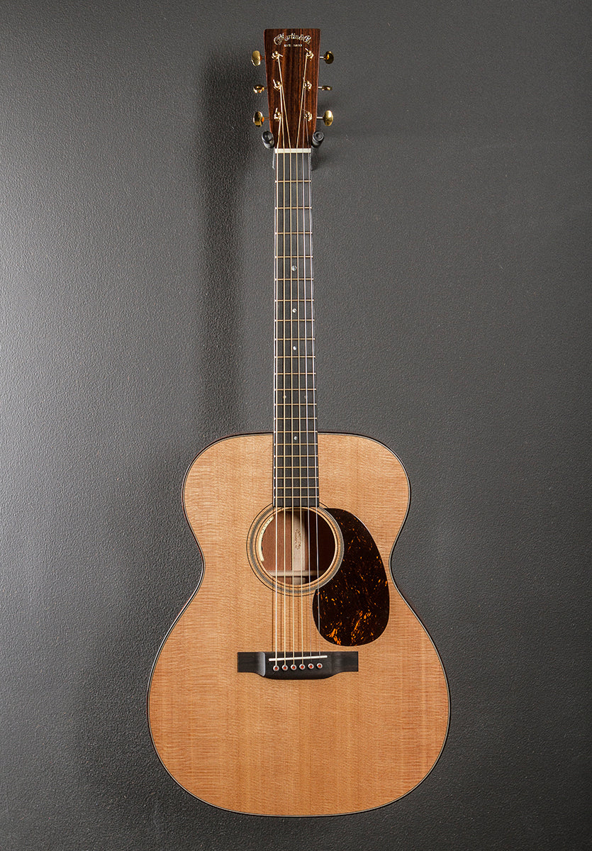 Natural, Gloss top and body finish, 000-14 Fret body shape, Solid Sitka Spruce top w/VTS, Adirondack Spruce scalloped X bracing w/VTS, Old Style 18 multi-stripe Rosette, East Indian Rosewood binding with the multi-stripe top inlay, Mahogany back and sides, Style 18 back purfling, Ebony fingerboard with the Abalone Old Style 18 position markers on a vintage deluxe w/high performance taper shaped Mahogany neck, 24.9″ scale length, 1 3/4” nut width, Waverly open gear tuners, The neck thickness is .79″ at the first and .86″ at the 9th frets, With the L.R. Baggs Anthem pickup system and Martin hardshell case, Excellent