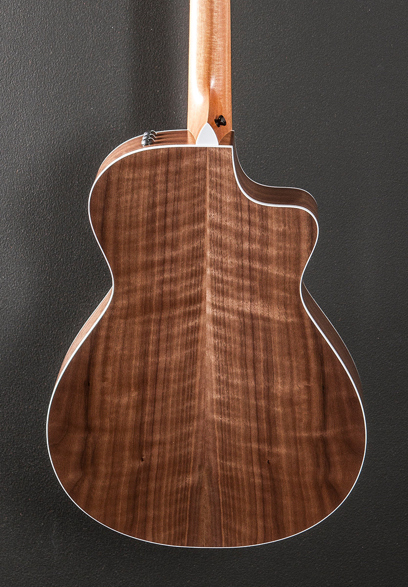 Natural, Matte finish, Grand Concert body shape with the venetian cutaway, Torrefied Spruce top, Three Ring Plastic Rosette, X bracing, Layered Walnut back and sides, White binding, West African Crelicam Ebony fingerboard with the faux pearl 4mm dot inlays on a Neo-Tropical Mahogany neck, 24 7/8th” scale length, 1 11/16th” nut width, Cast/sealed tuners, The neck thickness is .84″ at the first and .88″ at the 9th frets, With the Expression 2 pickup system and gig bag, Excellent