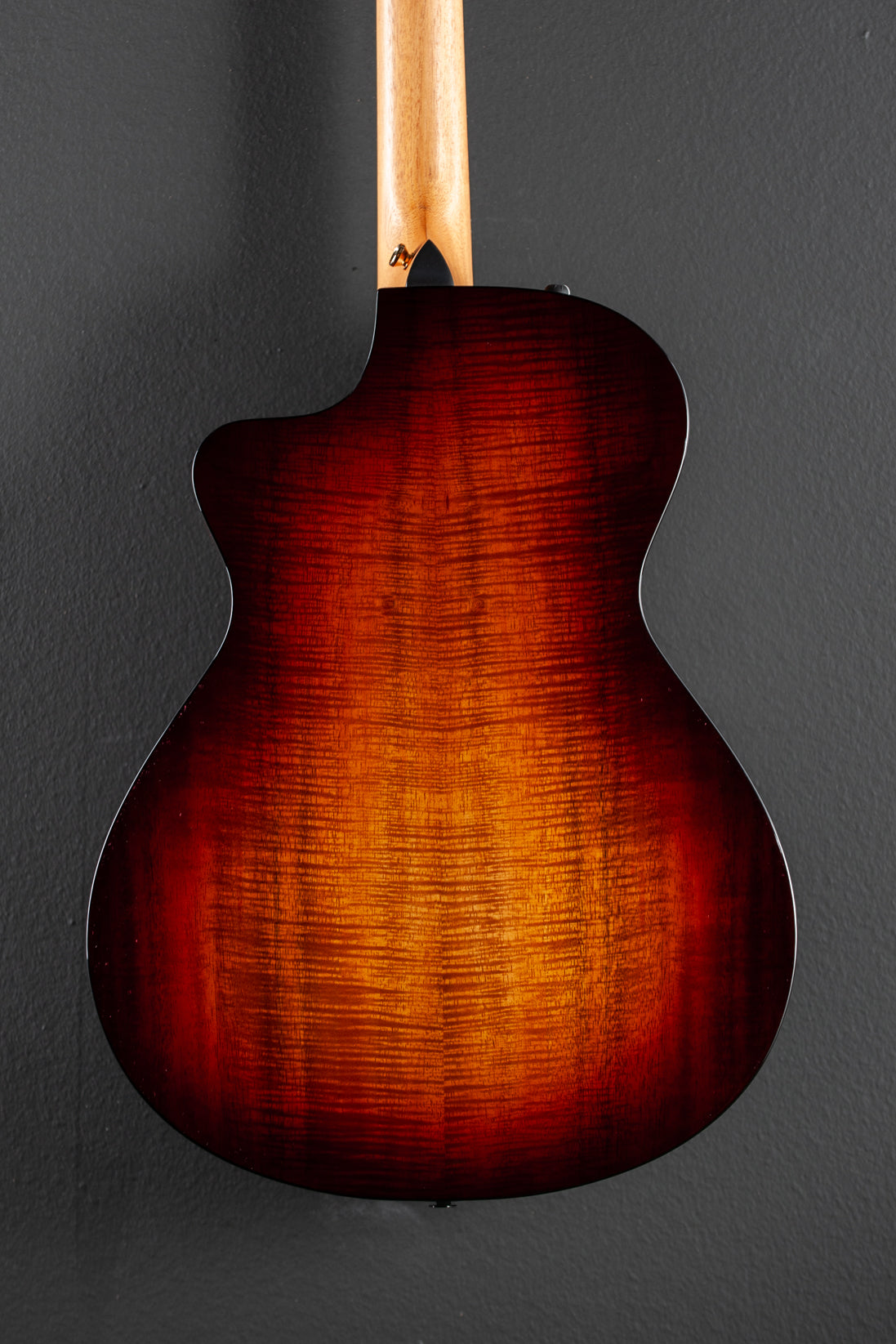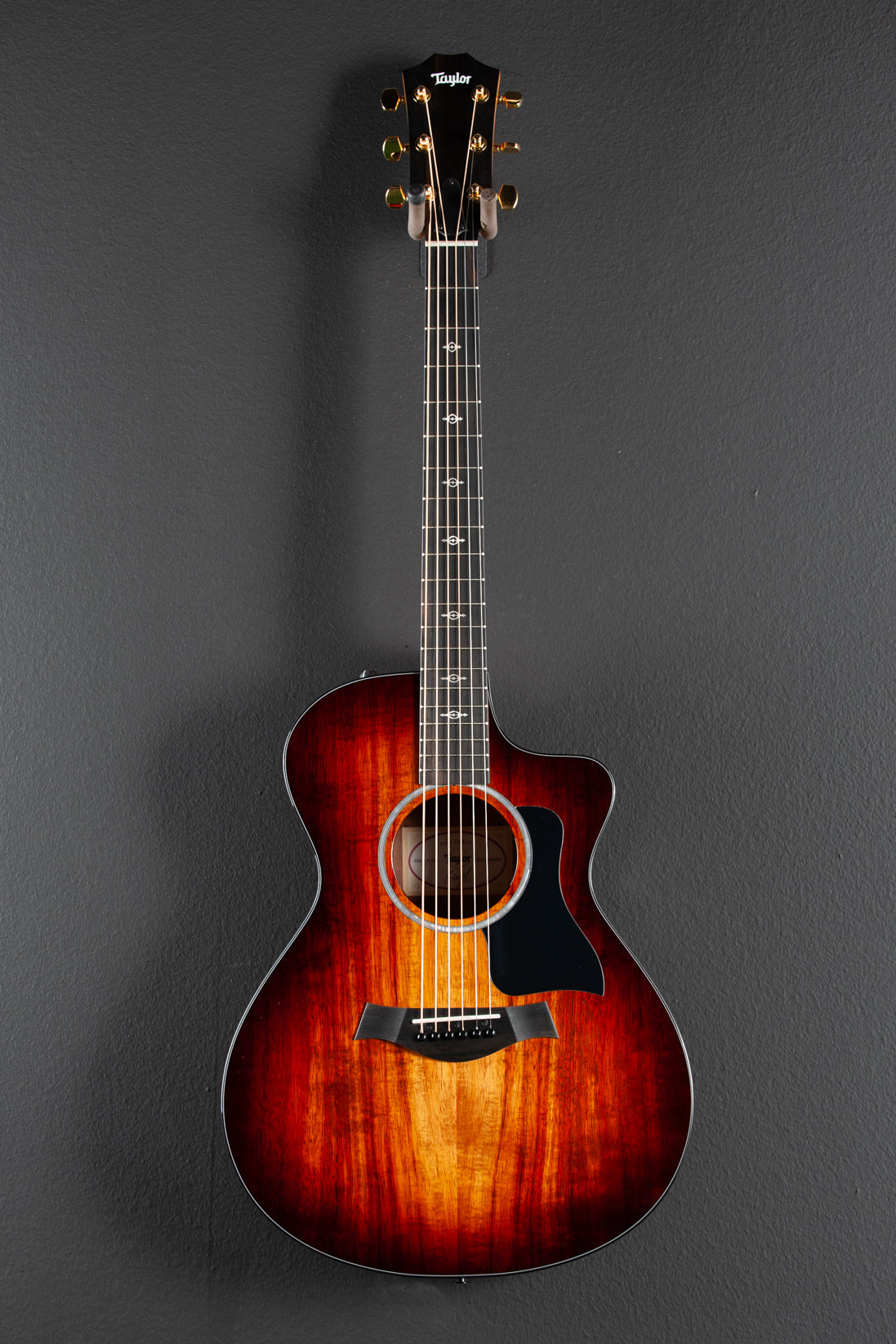 Shaded Edgeburst, Gloss top and body finish, Grand Concert body shape with the venetian cutaway, Hawaiian Koa top, Single Ring Faux Pearl Rosette, X bracing, Layered Hawaiian Koa back and sides, Black binding, West African Crelicam Ebony fingerboard with the faux pearl Sentinel inlays on a Neo-Tropical Mahogany neck, 24 7/8th” scale length, 1 11/16th” nut width, Cast/sealed tuners, The neck thickness is .82″ at the first and .87″ at the 9th frets, With the Expression 2 pickup system and Taylor hardshell case, Excellent