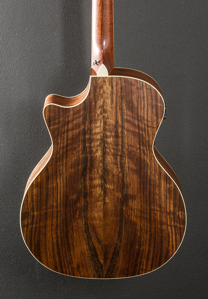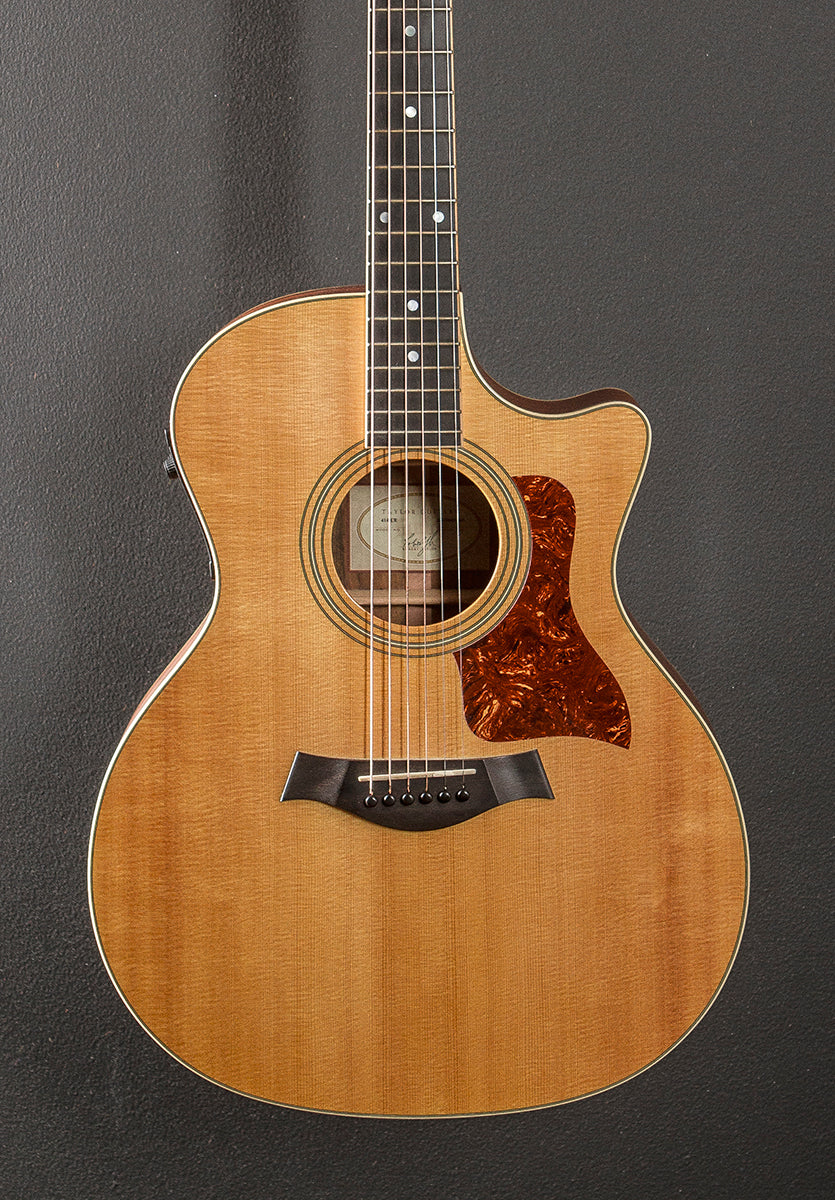 Natural, Gloss top and matte body/neck finish, Grand Auditorium body shape with the venetian cutaway, Sitka Spruce top, Three Ring Plastic Rosette, X bracing, Ovangkol back and sides, Tropical Mahogany neck, Bound 14" radius Ebony fingerboard with the dot inlays and medium frets, 25.5” scale length, 1 3/4” nut width, Grover tuners, The neck thickness is .83″ at the first and .87″ at the 9th frets, With the Fishman Prefix Plus pickup system and Taylor hardshell case, Very good