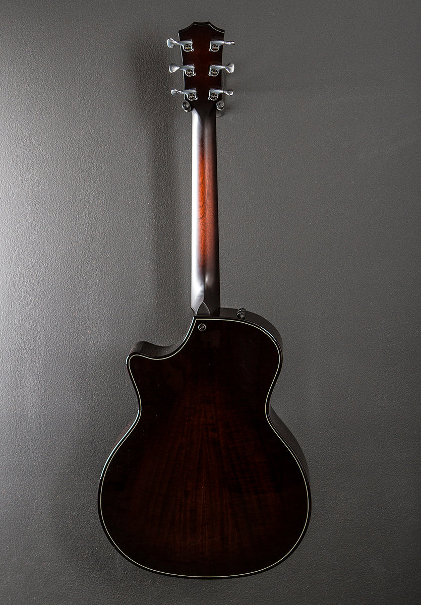 Kona Burst, Gloss top and body finish, Grand Auditorium body shape with the beveled cutaway and armrest, Neo-Tropical Mahogany top, Single Ring faux Pearl Rosette, V-Class bracing with Relief Rout, Shamel Ash back and sides, Chamfered body edges, West African Crelicam Ebony fingerboard with the faux Pearl Compass inlays on a Neo-Tropical Mahogany neck, 25.5” scale length, 1 3/4” nut width, Gotoh 510 tuners, The neck thickness is .83″ at the first and .87″ at the 9th frets, With the Expression 2 pickup system and Taylor hardshell case, Excellent