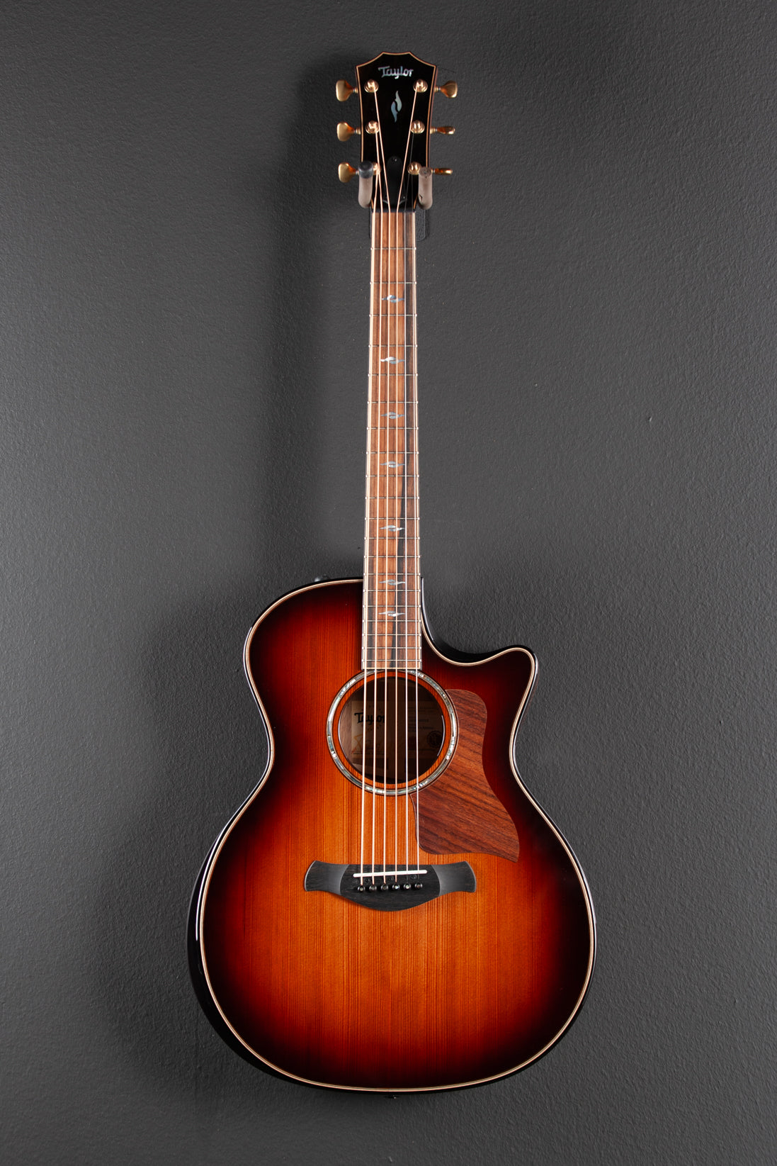 Shaded Edgeburst top with the Kona Edgeburst back and sides, Gloss top and body finish, Grand Auditorium body shape with the beveled cutaway and armrest, Sinker Redwood top, Single Ring Green Abalone Rosette, V-Class bracing with Relief Rout, Honduran Rosewood back and sides, West African Crelicam Ebony binding with the Maple/Rosewood top and Maple back edge trim, West African Crelicam Ebony fingerboard with the Mother of Pearl Windansea inlays on a Neo-Tropical Mahogany neck, 25.5” scale length, 1 3/4” nut width, Gotoh 510 tuners, With the Expression 2 pickup system and Taylor hardshell case, Very Good