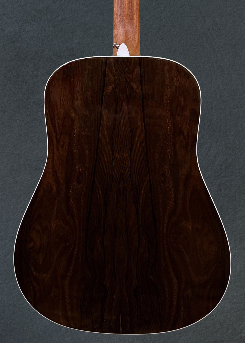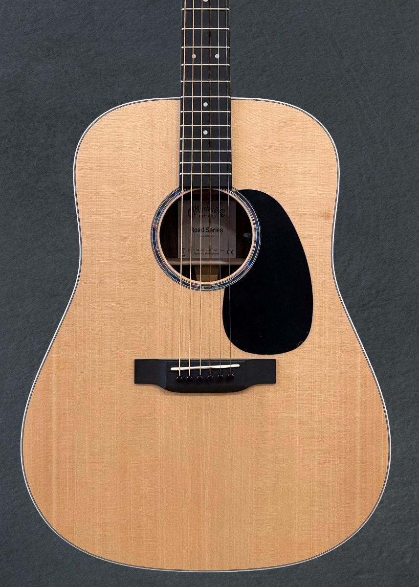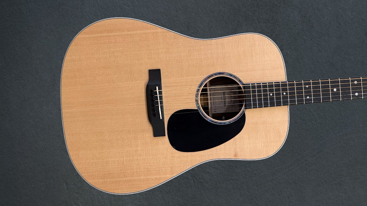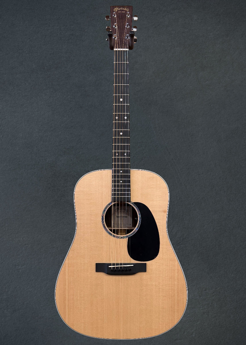 "With a gorgeous glossed Sitka spruce top and option of siris or ziricote back and sides, this solid wood Dreadnought model is a great sounding guitar at an affordable price. New to this model are stunning mother-of-pearl pattern fingerboard and rosette inlays, a multi-stripe rosette border, and white binding. It has an FSC® Certified Richlite® fingerboard and bridge, gloss body, and a hand-rubbed neck finish. Also new to this model is Fishman® MX-T electronics with a built-in soundhole tuner that auto mutes the audio output so you can tune up any time without using a pedal. This guitar comes with a Premium Soft Shell Case so it is Road-ready to join you on all of your adventures! Due to material availability the D-13E Ziricote is designed with either a tortoise pattern or black pickguard. Selection may vary."