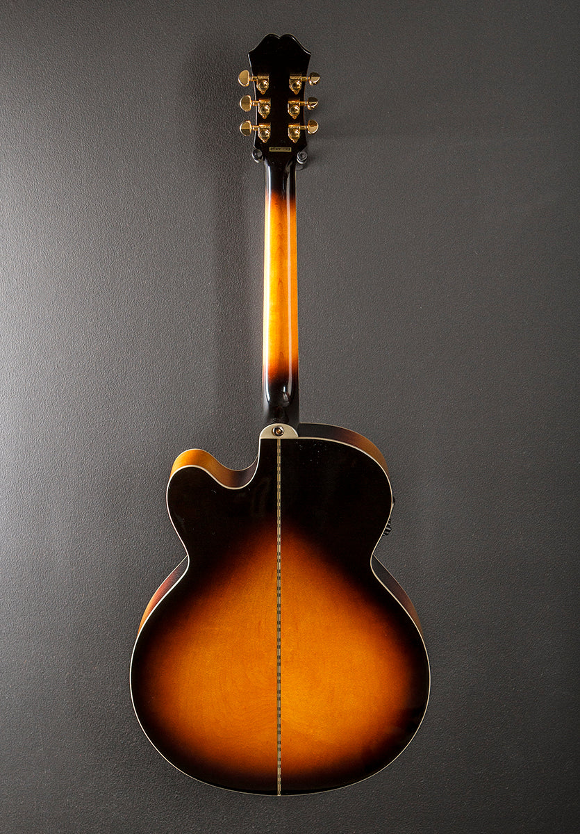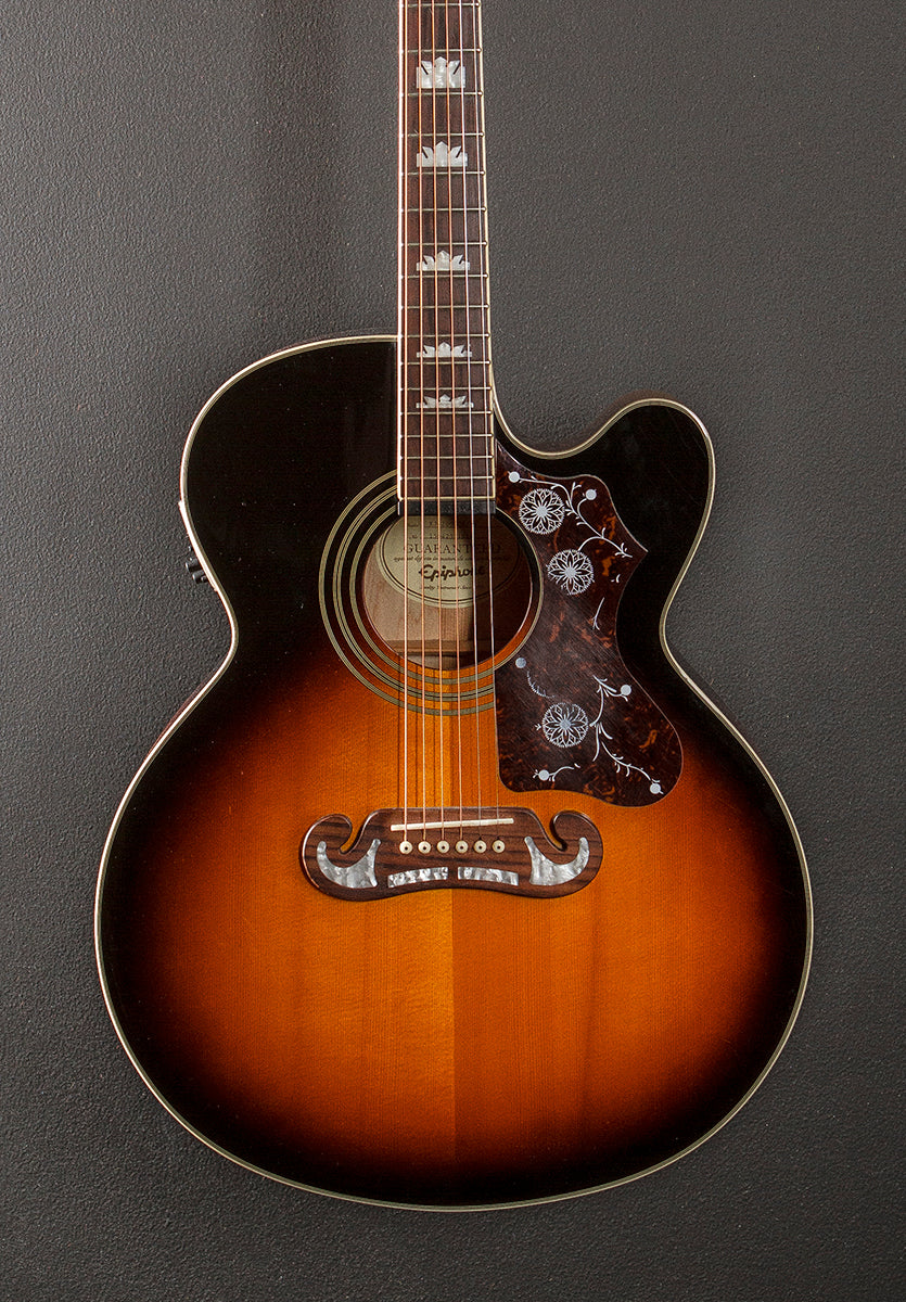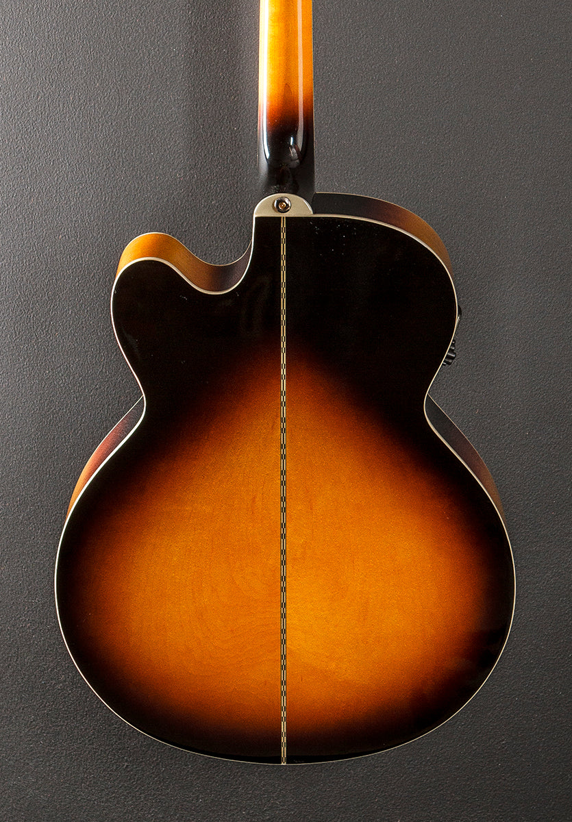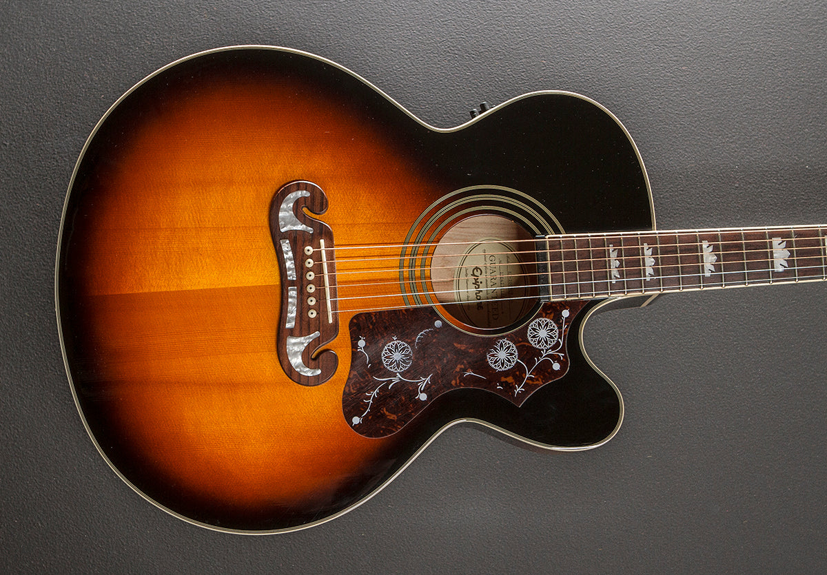 Vintage Sunburst, Gloss finish, Super jumbo cutaway body shape, Spruce top, Three Ring Rosette, Laminated Maple back and sides, Slim taper shaped Maple neck, Bound 12" radius Rosewood fingerboard with the crown inlays and medium frets, 25.5" scale length, 1 11/16th" nut width, Grover Rotomatic tuners, The neck thickness is .83″ at the first and .92″ at the 9th frets, With the Shadow E Sonic 2 pickup system and hardshell case, Very good