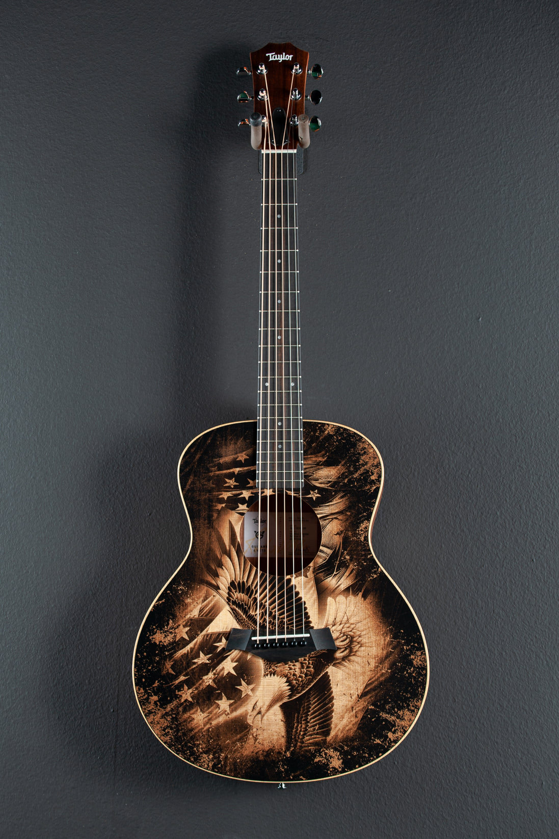 Custom Americana artwork, Matte finish, Miniature Grand Symphony body shape, Torrefied Spruce top, X bracing, Layered Sapele back and sides, Ebony fingerboard with the faux pearl 4mm dot inlays on a Tropical Mahogany neck, 23.5″ scale length, 1 11/16th” nut width, Cast/sealed tuners, The neck thickness is .83″ at the first and .88″ at the 9th frets, With gig bag, Excellent
