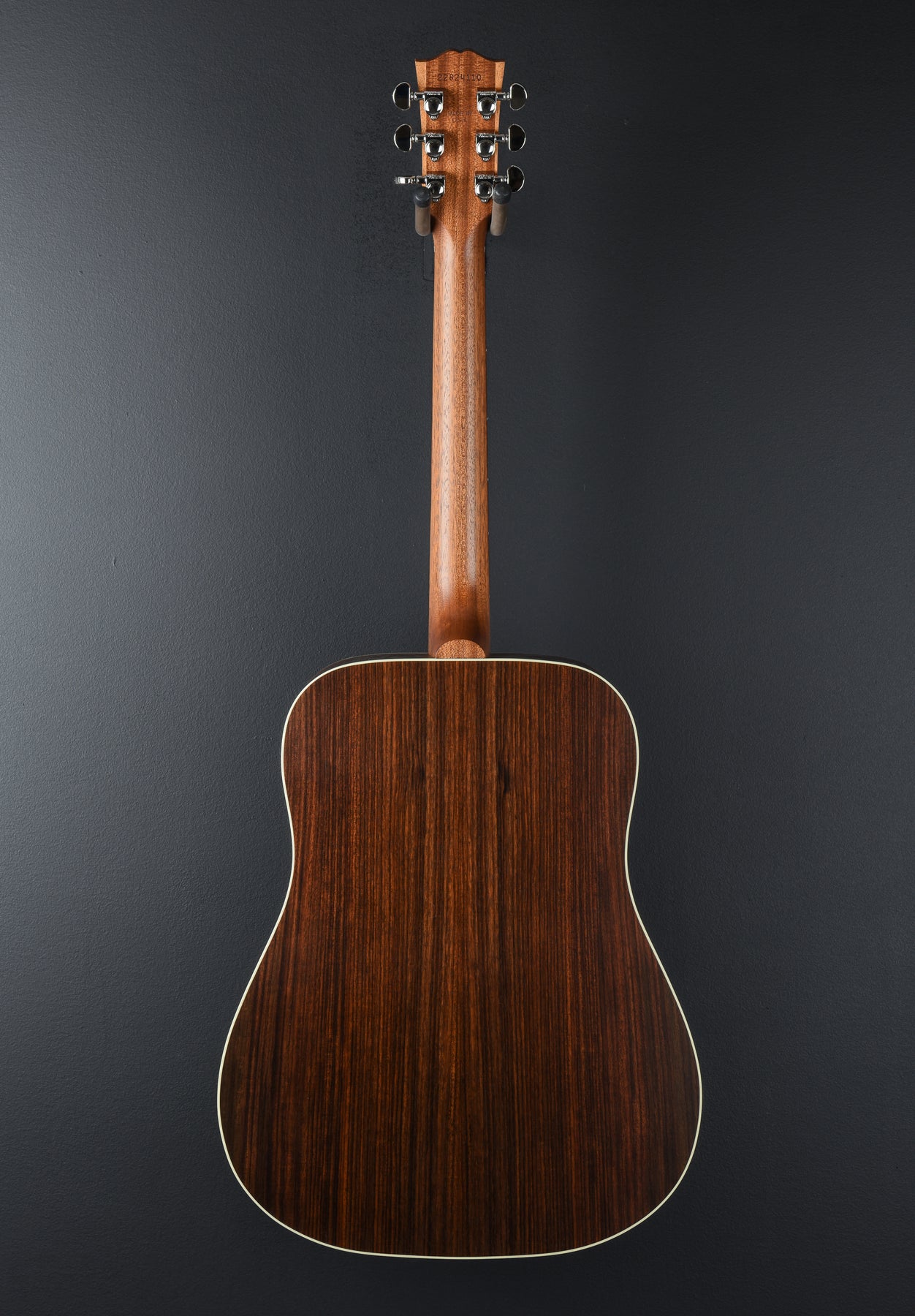 Satin Rosewood Burst, Square Shoulder Hummingbird body shape, Satin nitrocellulose lacquer finish, Sitka Spruce top, Traditional hand scalloped X bracing, Multi-ply top and single-ply back binding, Rosewood back and sides, Advanced response shaped Utile neck, 16” radius Rosewood fingerboard with the Mother of Pearl Parallelogram inlays and standard frets, 24.75″ scale length, 1.72″ nut width, Grover Rotomatic tuners, With the L.R. Baggs Element pickup system and hardshell case