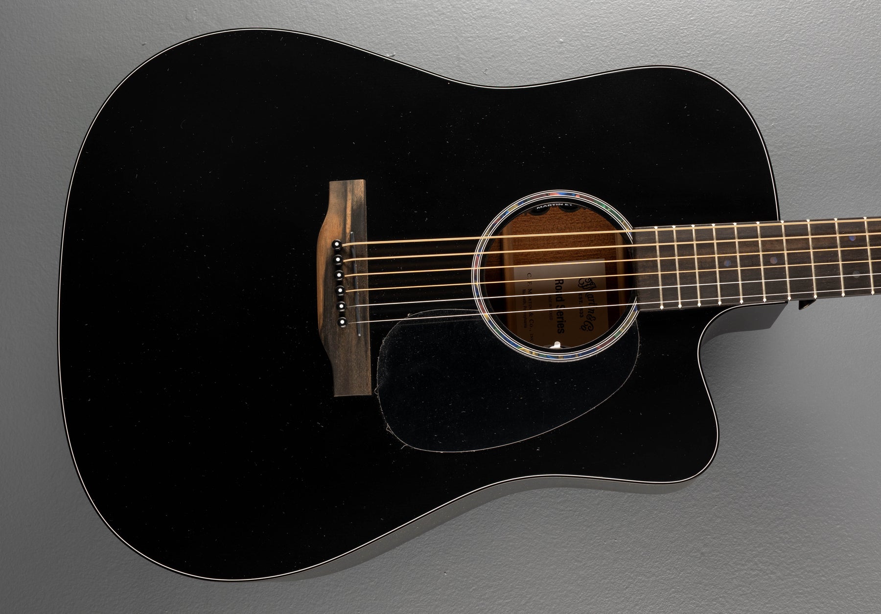 "The Martin DC-10E Modern Black offers a bold, all-black look backed by the tone and feel serious players demand. Its satin Dreadnought cutaway body pairs a solid spruce top with solid sapele back and sides for punchy mids, clear trebles, and low-end power. Scalloped X-bracing enhances projection and clarity, while the cutaway invites you to explore the highest frets with ease. A Performing Artist neck with high-performance taper keeps playability smooth and fast, and blacked-out appointments—including the binding, tuners, and pickguard—add to its stealth appeal. With versatile E1 electronics, a built-in tuner, and a softshell case, the DC-10E Modern Black is built to perform—on stage, in the studio, and anywhere your music takes shape."