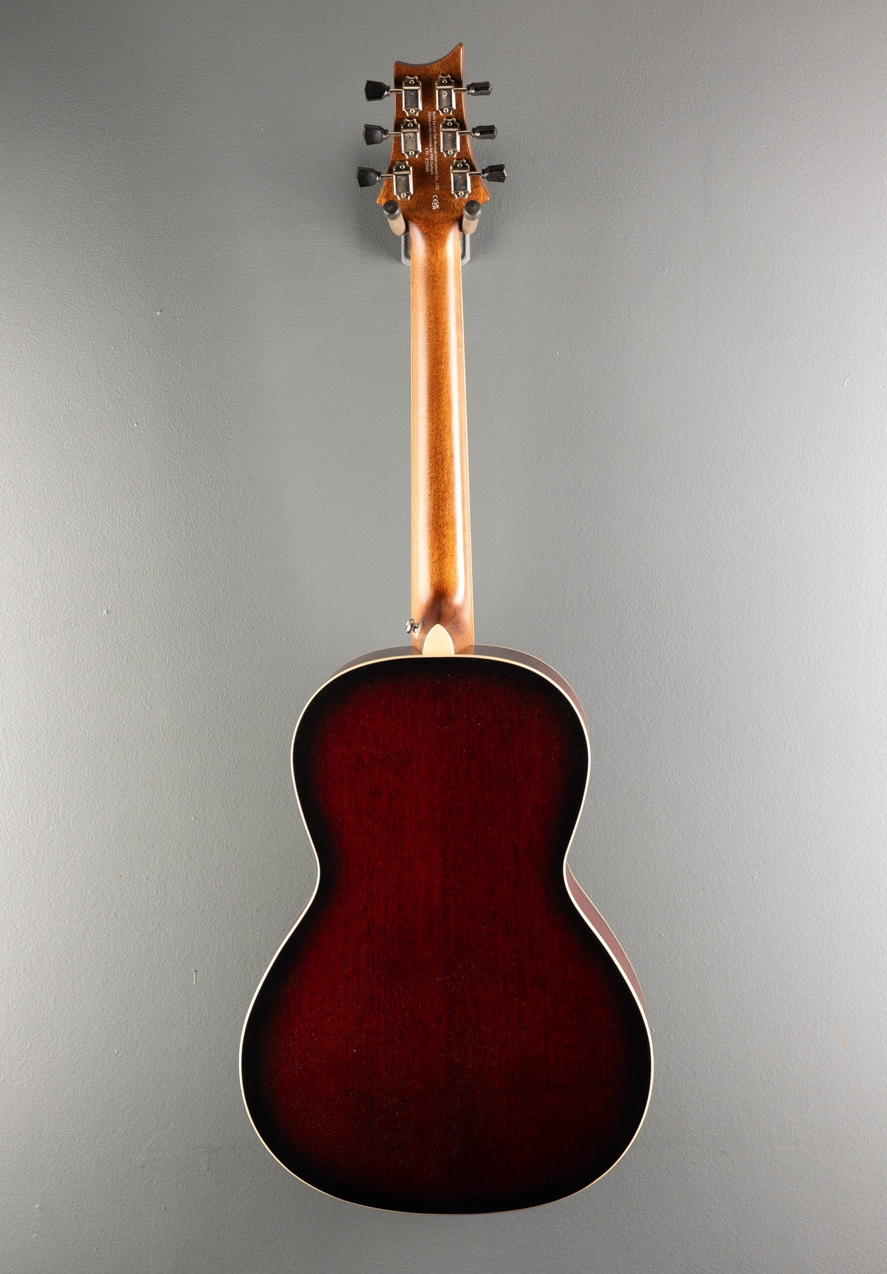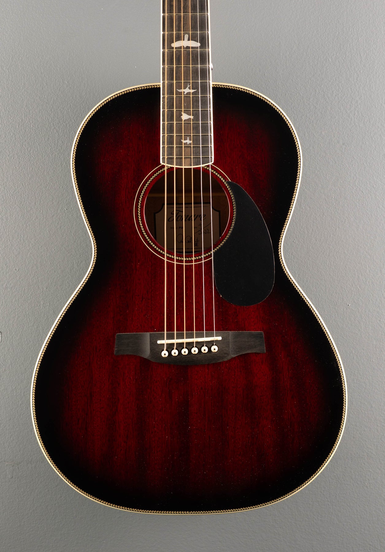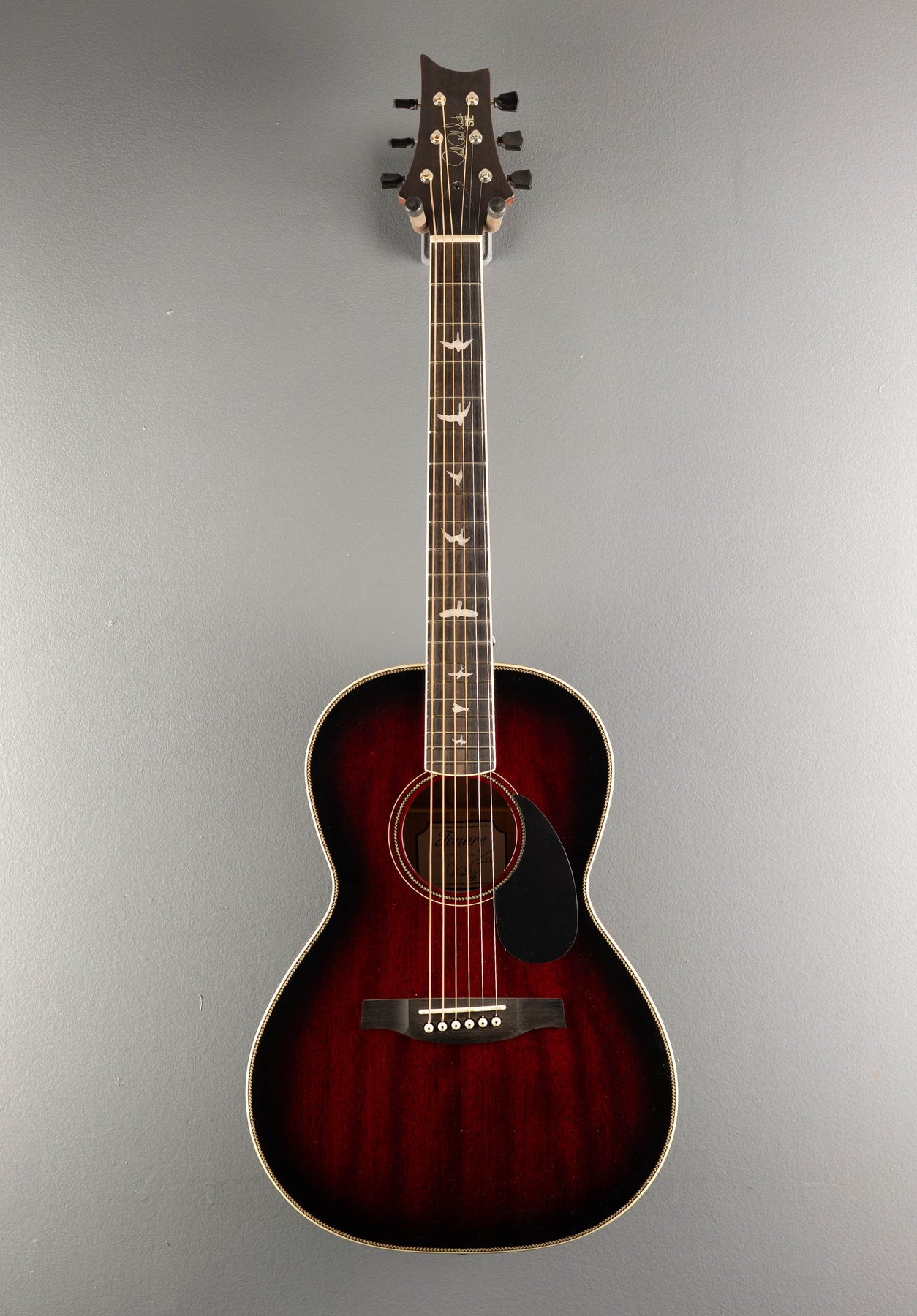 Excellent Condition, Fire Red Burst, Gloss Top with Satin back and sides, Tonare Parlor body shape, Solid Mahogany top, PRS Hybrid “X”/Classical bracing pattern, Crème/Herringbone Rosette, Mahogany back and sides, Crème binding with the Herringbone top inlay, 11.81″ radius Ebony fingerboard with the Bird inlays on a Wide Fat shaped Mahogany neck, 24.72″ scale length, 1 11/16th” nut width, Neck Thickness is .90" at the 1st fret and 1.01" at the 9th, With the Fishman GT1 pickup system, case not included.