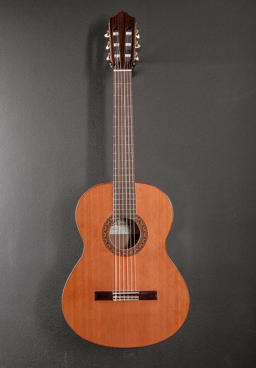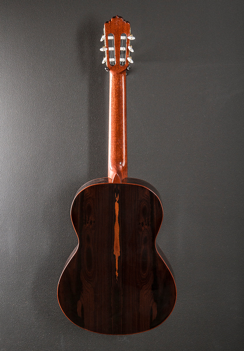 Natural, Made in Spain, Gloss finish, Student series body shape, Solid Red Cedar top, Mosaic Rosette, Ziricote back and sides, Mahogany binding, D shaped Mahogany neck with a flat Indian Rosewood fingerboard and narrow tall frets, 25.6" scale length, 2 1/16th" nut width, Strip tuners, The neck thickness is .84″ at the first and .93″ at the 9th frets, With hardshell case, Very good