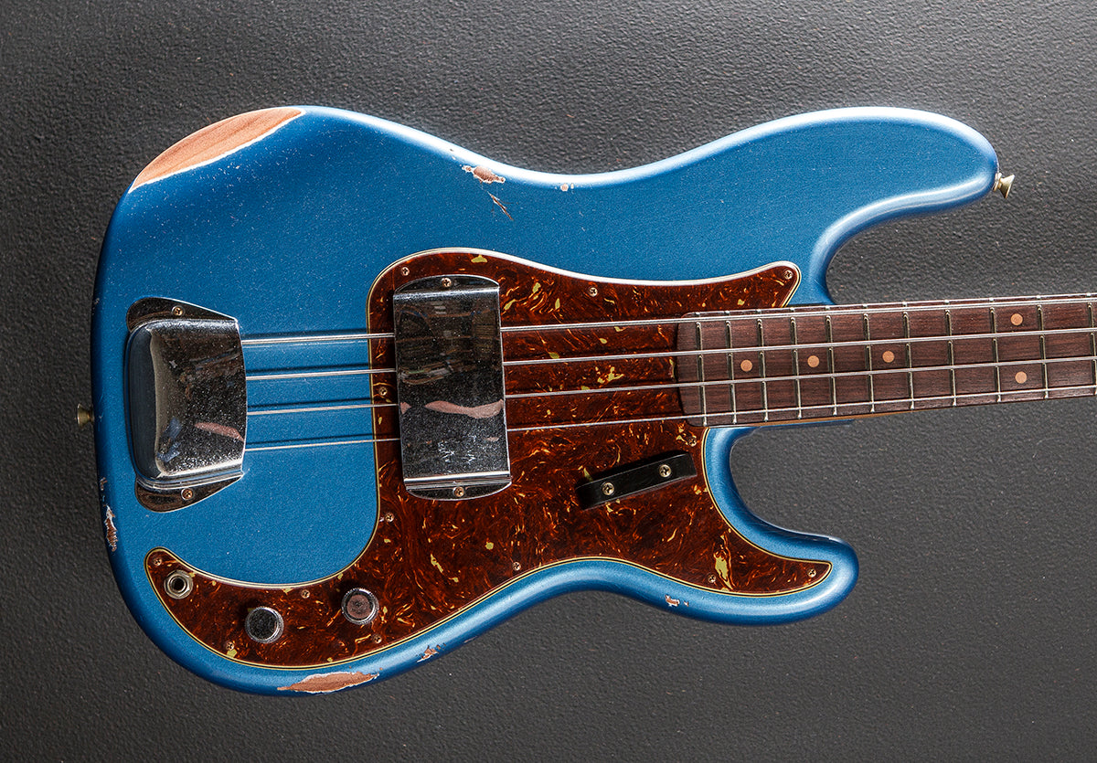 Lake Placid Blue, Aged nitrocellulose lacquer finish, Alder body, 1960 oval C shaped quartersawn Maple neck with a 7.25” radius Rosewood fingerboard and medium jumbo frets, 34” scale length, 1 3/4” nut width, Handwound '62 Relic Precision Bass pickup with the master volume and tone controls, American Vintage Precision Bass bridge with the threaded steel saddles, Fender vintage style open gear tuners, The neck thickness is .79″ at the first and 1.01″ at the 12th frets, 8.8 pounds, With hardshell case