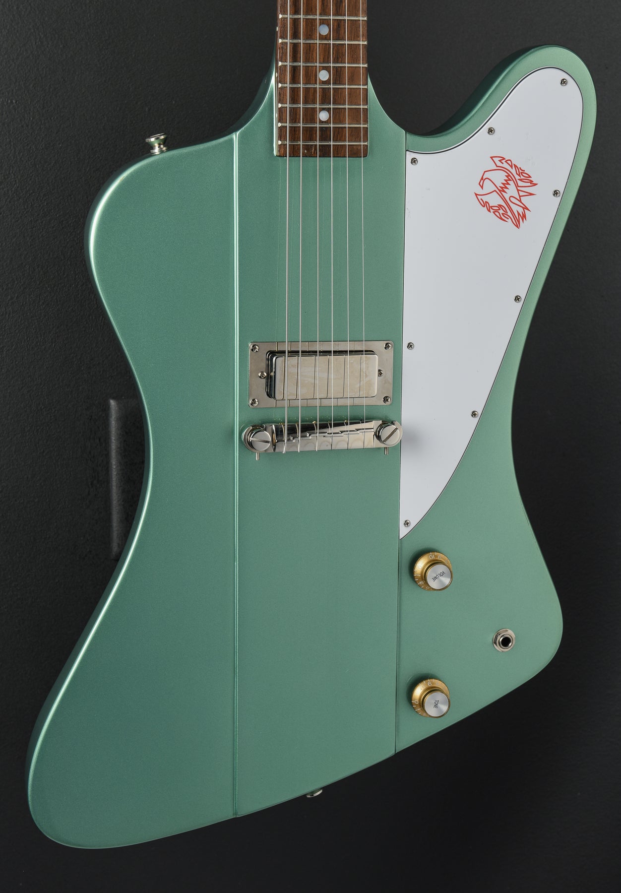 Inverness Green, Mahogany body wings, 12" radius Indian Laurel fingerboard with mother of pearl dot inlays and medium jumbo frets on a 1963 Firebird shaped 9 ply Mahogany/Walnut thru body neck, 24.75" scale length, 1 11/16" nut width, Gibson USA Firebird Mini Humbucker with volume and tone controls, wraparound lighting bar bridge, Kluson Banjo Style Planetary tuners, 7.3 pounds, comes with hardshell case.