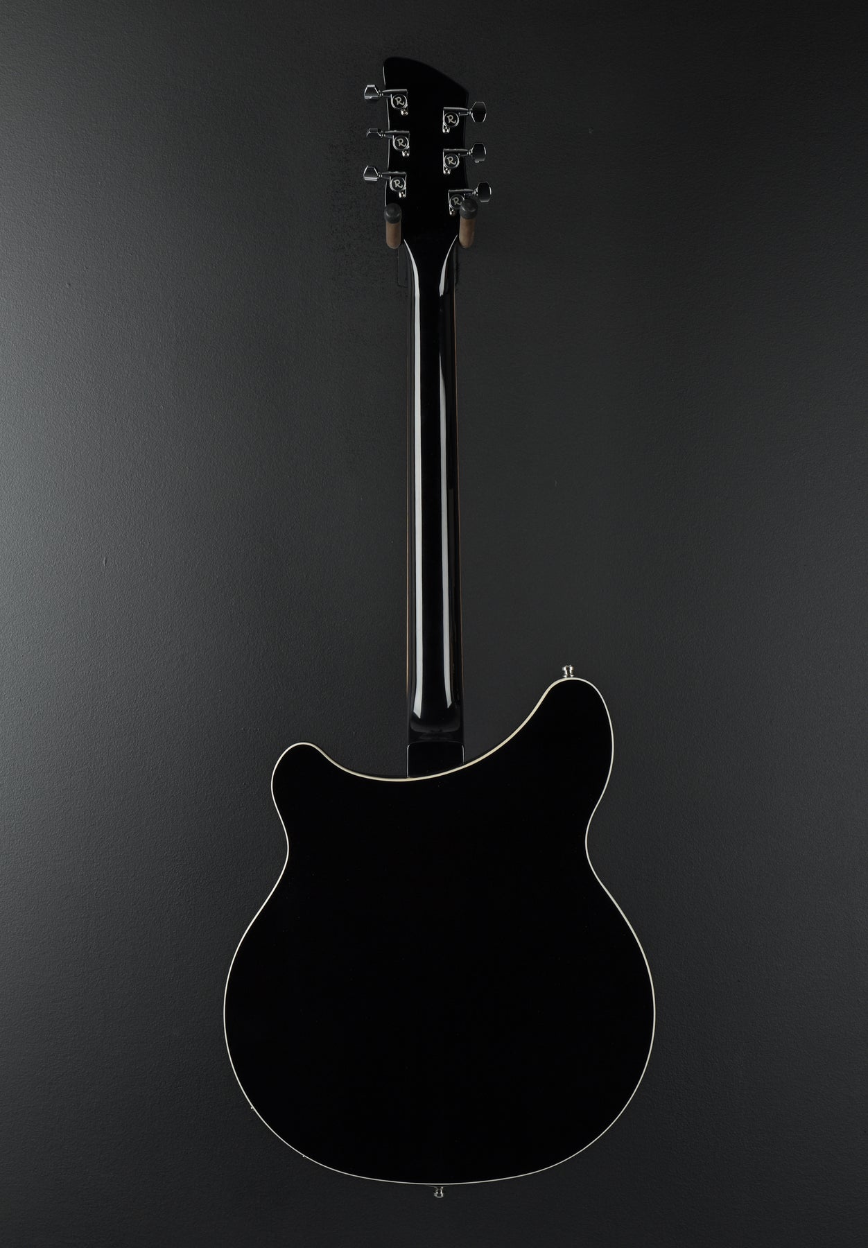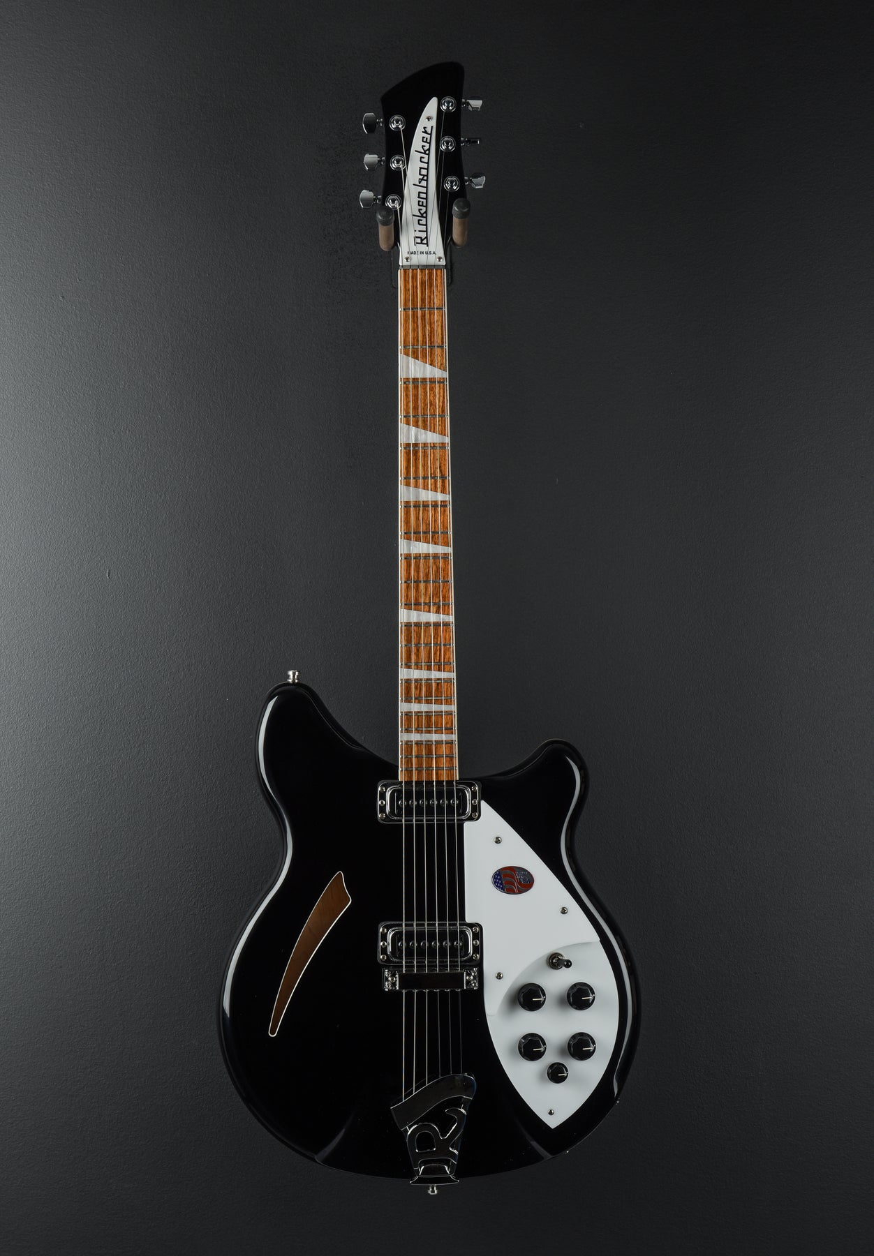 Jetglo Finish, 15″ Wide Semi-Hollow Maple Body, Set-In Maple/Walnut Neck, Bound 10″ Radius Rosewood Fingerboard with Triangle Inlays, 24.75″ Scale Length, 1.63″ Nut Width, Rickenbacker Hi-Gain Bridge and Neck Pickups, 3-Way Toggle Switching with Volume and Tone Controls for Each Pickup plus Bass Blend Control, Mono and Stereo Output Jacks, 6-Saddle Bridge and “R” Tailpiece, Gotoh Tuners, 7.5 Pounds, With Hardshell Case.