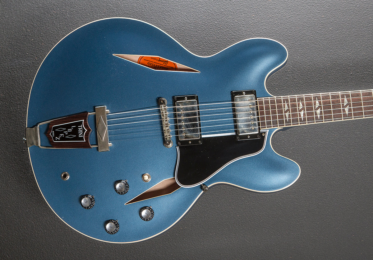 Pelham Blue, VOS nitrocellulose lacquer finish, Semi-hollow 3-ply Maple/Poplar/Maple body with a solid Maple centerblock, Long tenon and hide glue neck joint, Authentic '64 medium C shaped Mahogany neck, Bound 12” radius Indian Rosewood fingerboard with the Split Diamond cellulose nitrate inlays and authentic medium jumbo frets, 24.75″ scale length, 1 11/16th″ nut width, Gibson unpotted Custombucker Alnico III bridge and neck pickups, 3-way toggle switching with the volume and tone controls for each pickup, No wire ABR-1 tune-o-matic bridge with the nylon saddles, Single Diamond trapeze tailpiece with the Trini Lopez insert, Kluson single line strip tuners, The neck thickness is .87″ at the first and .96″ at the 12th frets, 8.0 pounds, With the certificate and Gibson hardshell case, Excellent