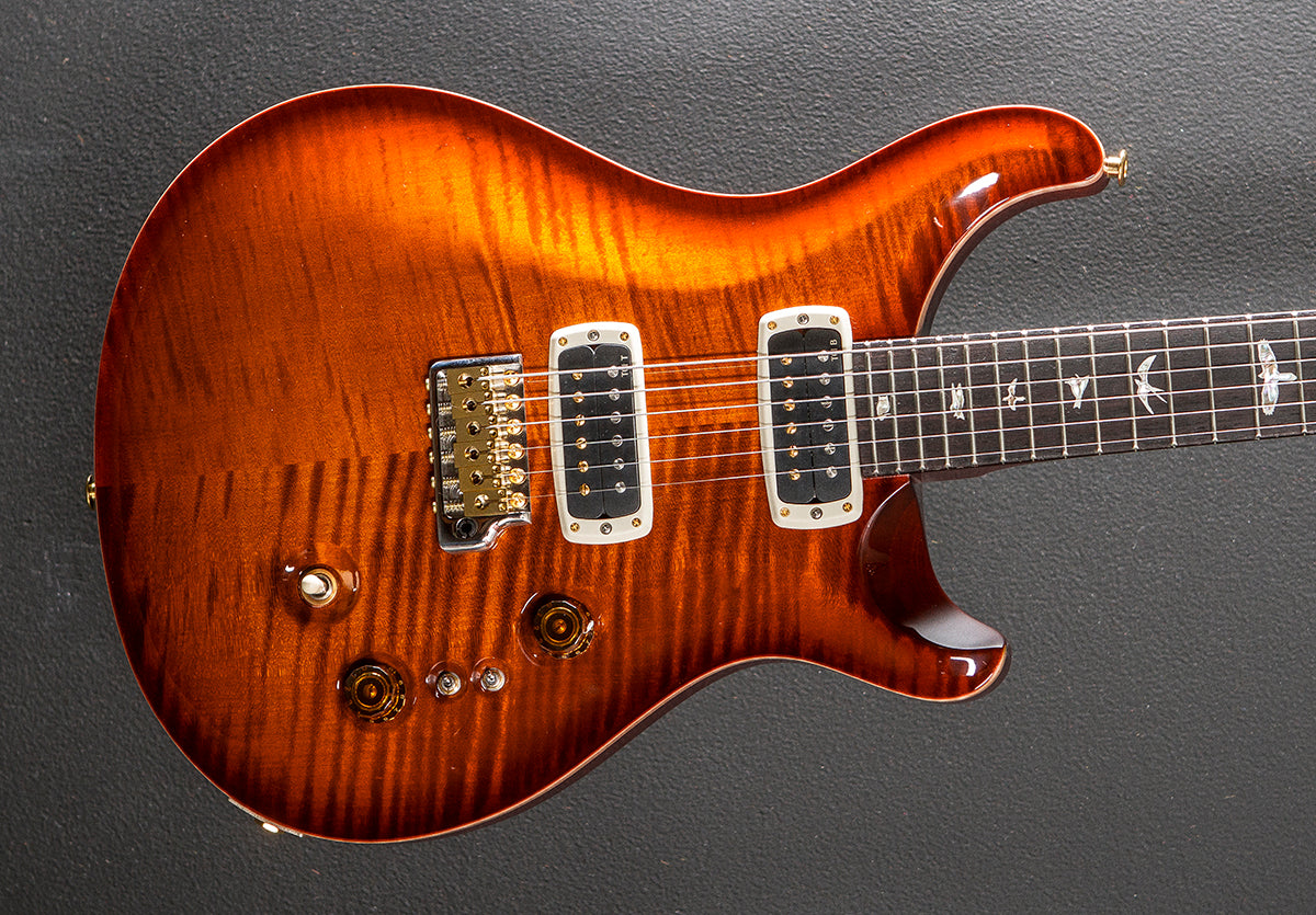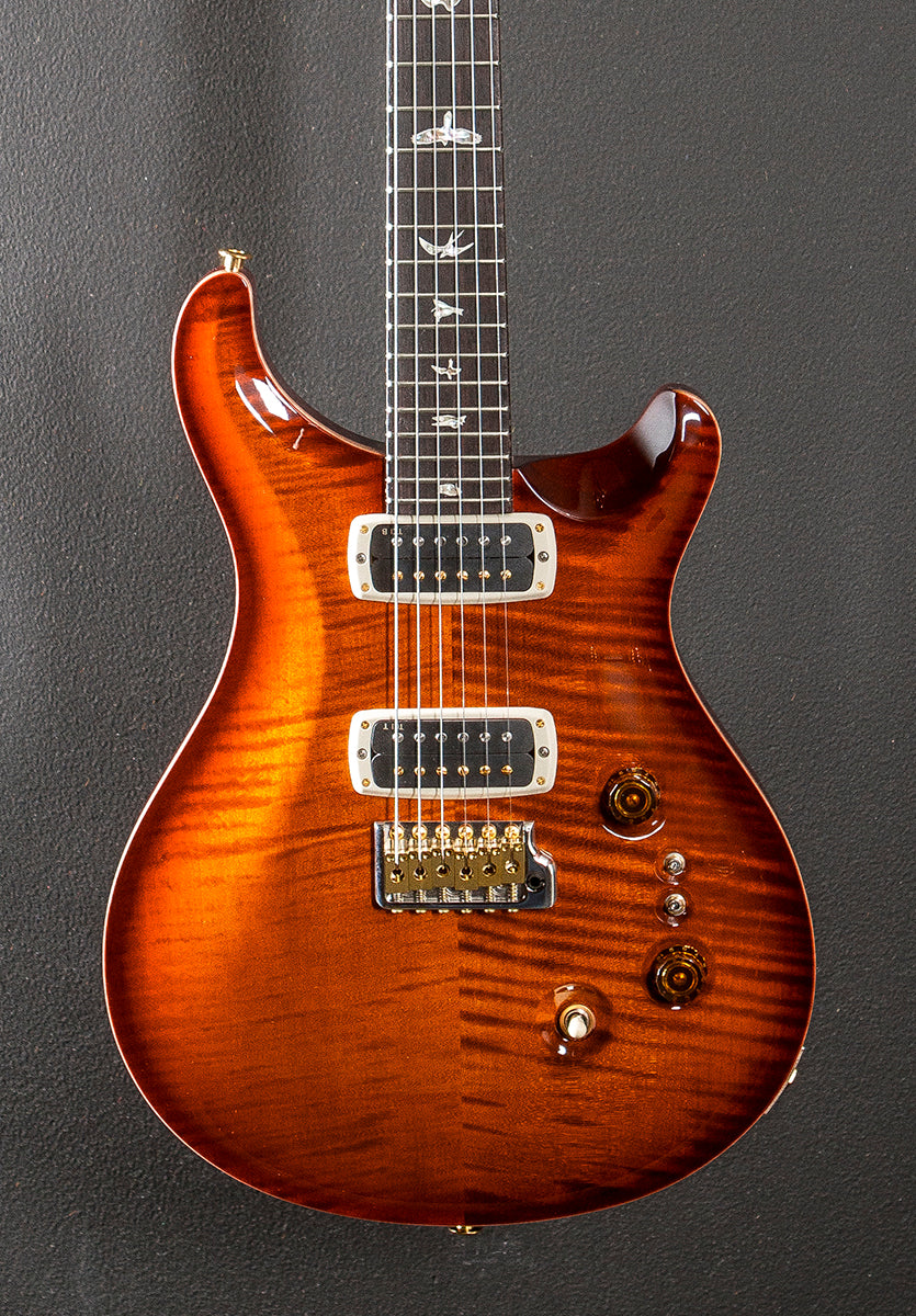 Dark Cherry Sunburst, High gloss nitro finish, Violin carved Flame Maple 10 top, Mahogany body, Pattern Thin carved Mahogany neck, 10" radius Rosewood fingerboard with the Bird inlays, 25" scale length, 1 11/16th" nut width, PRS TCI bridge and neck pickups, 3-way toggle switching with the master volume and tone controls plus the two mini-toggle EQ switches, PRS Gen III tremolo, PRS Phase III locking tuners with the wing buttons, The neck thickness is .82″ at the first and .90″ at the 12th frets, 7.8 pounds, With the PRS hardshell case, Excellent