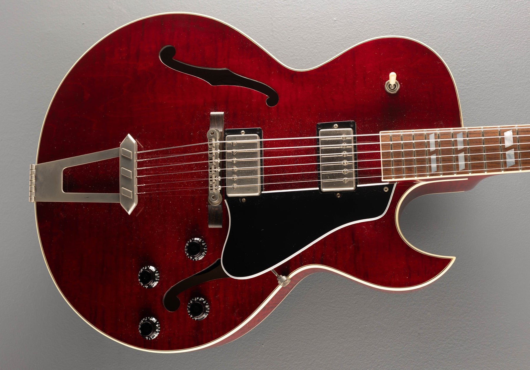 Vintage Cherry, Gloss nitrocellulose lacquer finish, Hollow laminated figured Maple body, Slim taper shaped Mahogany neck, Bound 12” radius Rosewood fingerboard with the parallelogram inlays and medium jumbo frets, 24.75" scale length, 1 11/16th" nut width, Gibson '57 Classic bridge and neck pickups, 3-way toggle switching with the volume and tone controls for each pickup, ABR-1 tune-o-matic bridge with the Rosewood base, Trapeze tailpiece and Gibson deluxe tuners, 7.0 pounds, With the original Gibson hardshell case