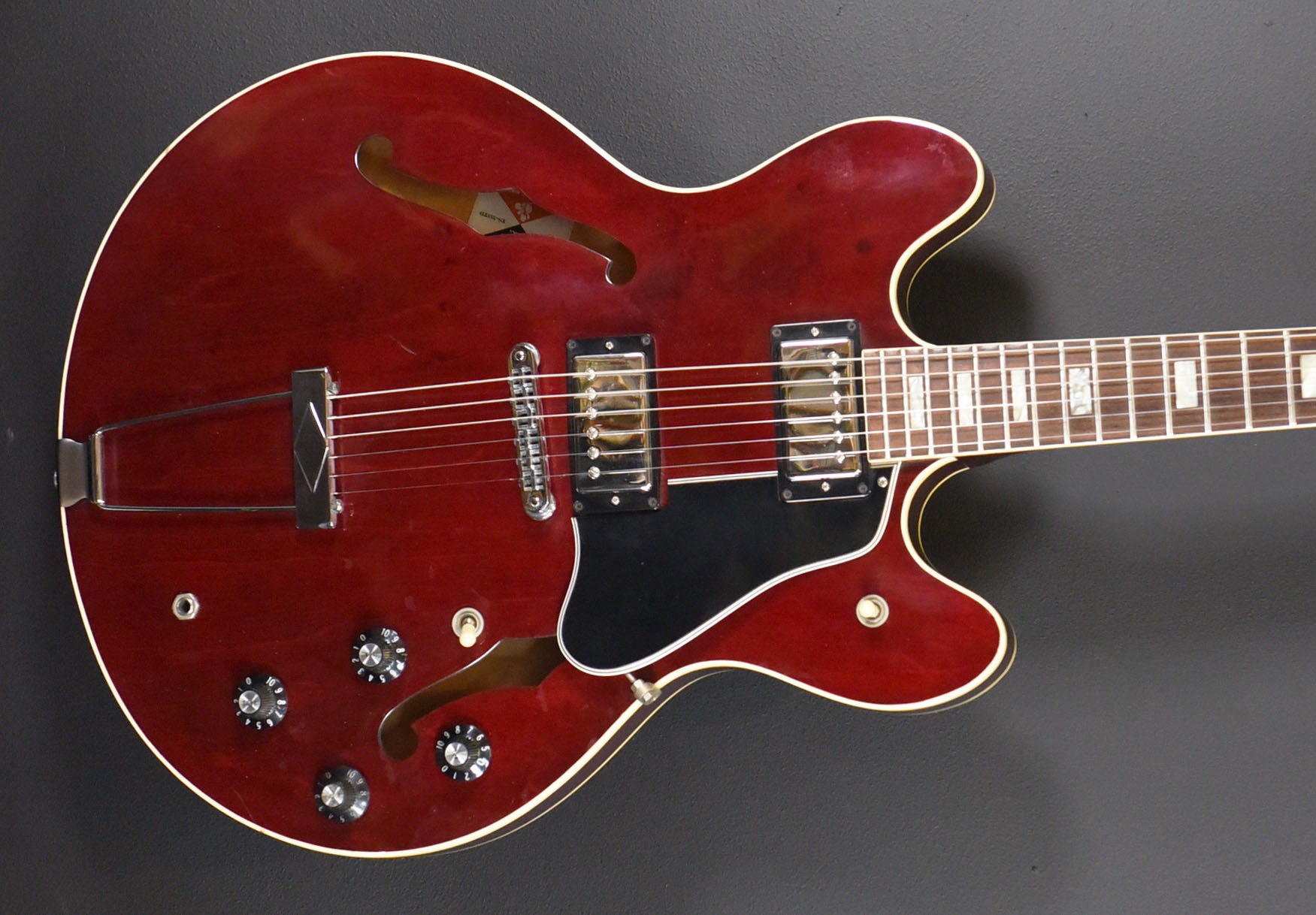 Wine Red, Semi-hollow Maple body with the Maple centerblock, Slim taper shaped three piece Maple neck with the volute, 8.25 lbs. Bound 12″ radius Rosewood fingerboard with the small block inlays and the original low profile frets, 24.75″ scale length, 1 9/16th” nut width, Stock pickups, 3-way toggle switching with the volume and tone controls for each pickup, ABR-1 tune-o-matic bridge and trapeze tailpiece, stock Gibson tuners, With newer Gibson hardshell case, Very good