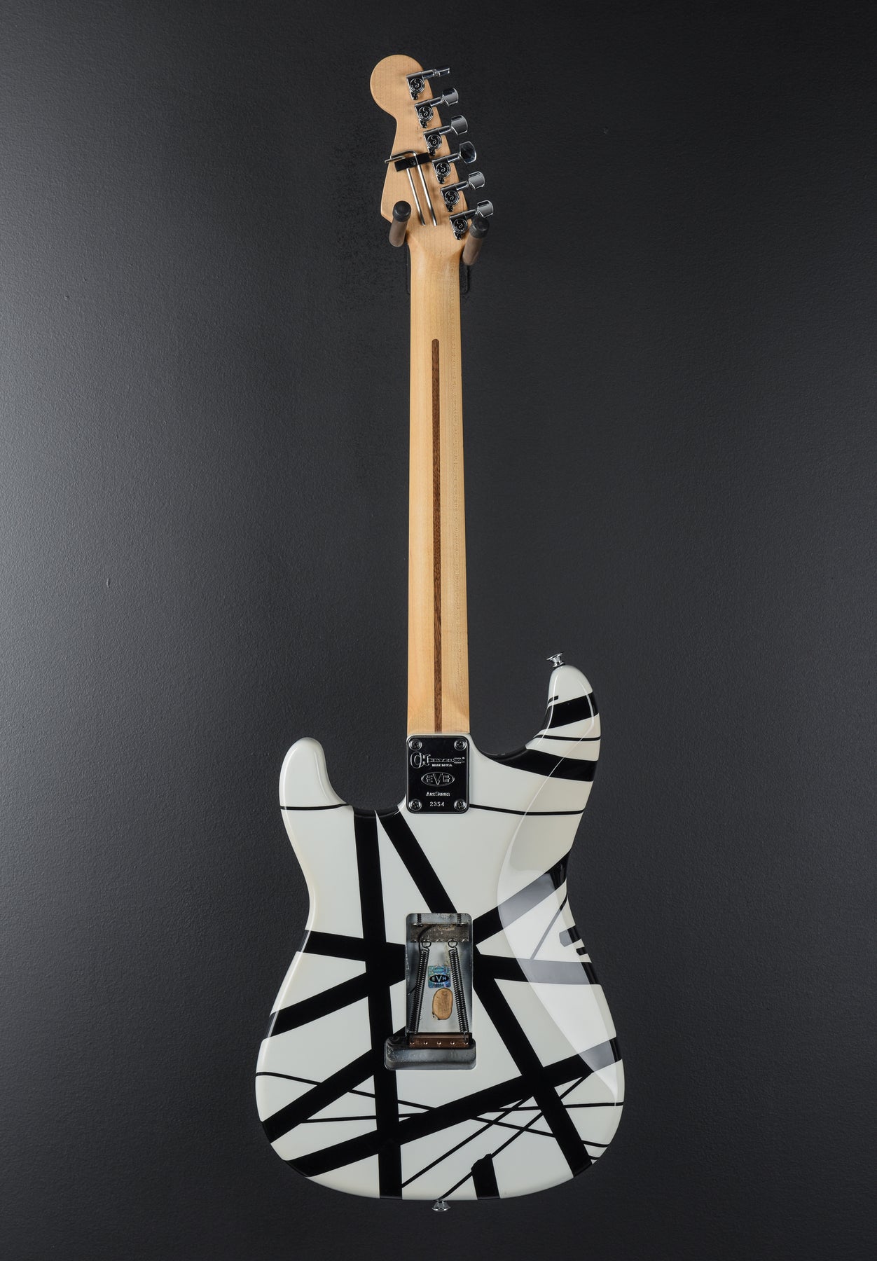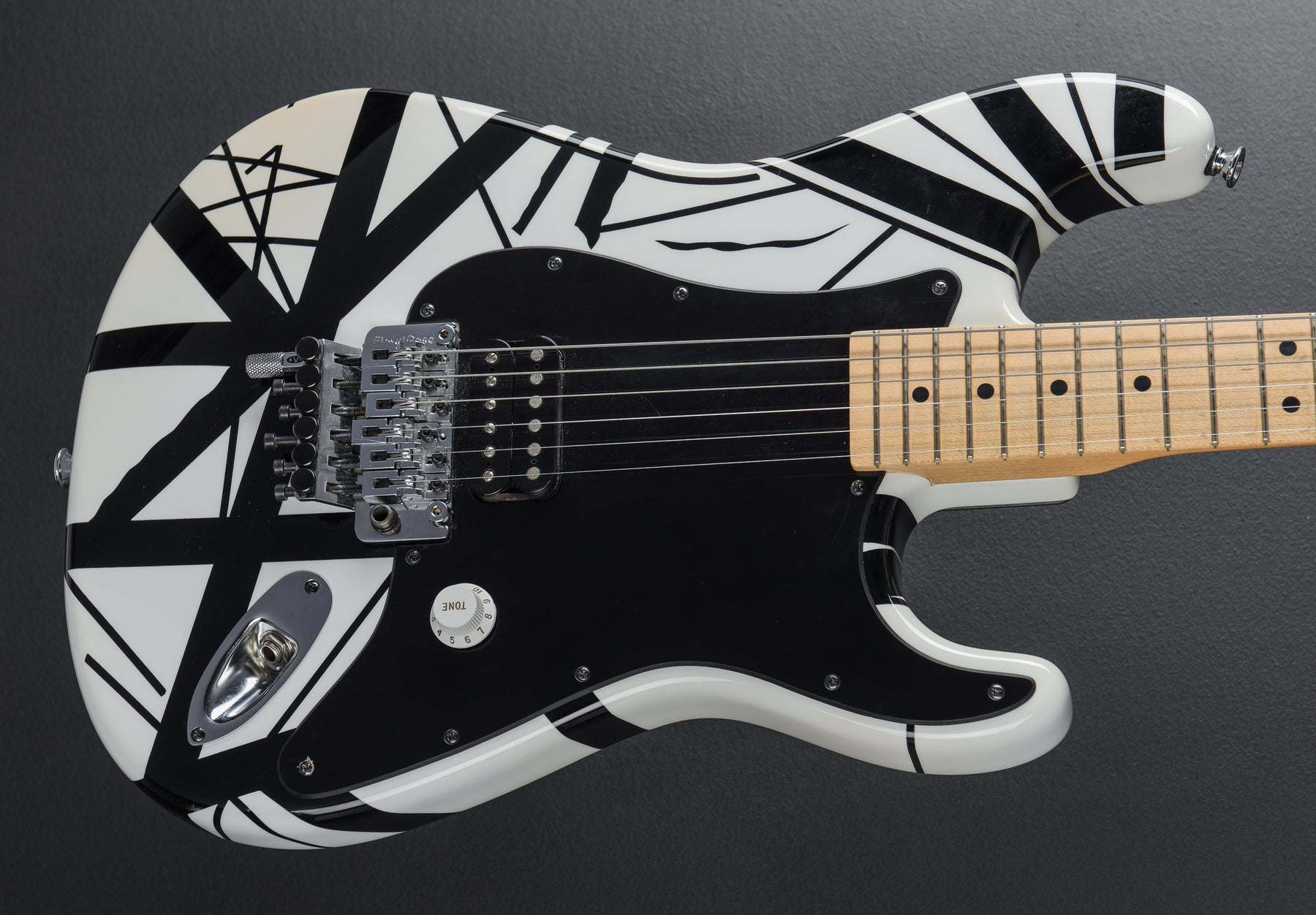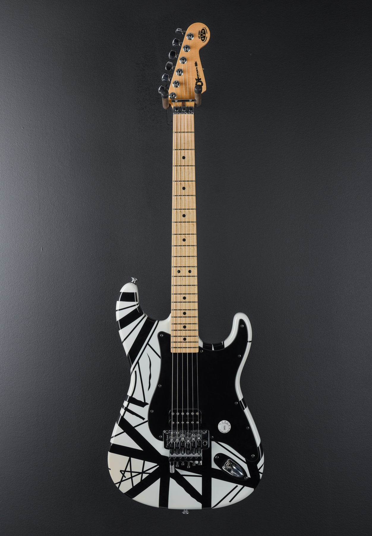 Very Good Condition, White/Black Stripe Finish, Basswood Body, Bolt-On Quartersawn Hard Rock Maple Neck With a 12″–16″ Compound Radius Maple Fingerboard and 22 Jumbo Frets, Schaller Tuners Black Dot Inlays, 25.5″ Scale Length, 1 11/16″ Nut Width, EVH High Output Bridge Humbucker, Master Volume Control, Original Floyd Rose Tremolo with D-Tuna, 8.2 Pounds, Comes With Original Hardshell Case.