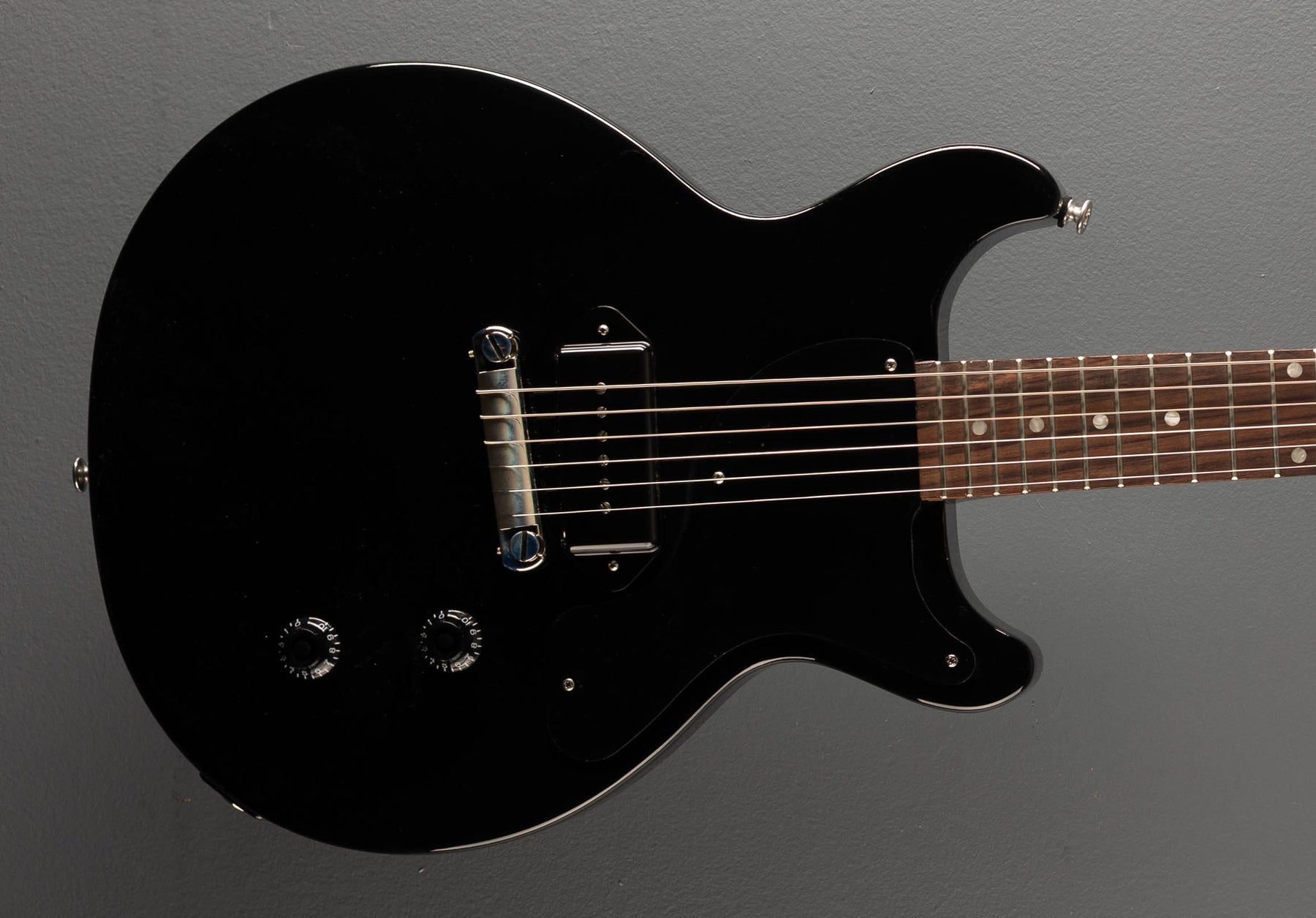 Ebony, Gloss nitrocellulose lacquer finish, Mahogany body, Slim taper shaped Mahogany neck, 12" radius Rosewood fingerboard with the acrylic dot inlays and medium jumbo frets, 24.75" scale length, 1.7" nut width, Dogear P-90 bridge pickup with the master volume and tone controls, Wraparound stop tailpiece and Gibson vintage deluxe tuners, 7.4 pounds, With hardshell case
