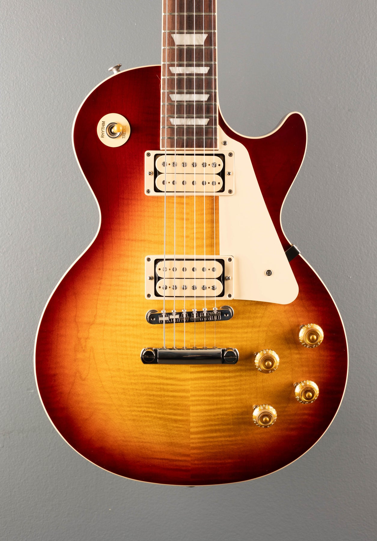 Vintage Bourbon Burst Gloss, Gloss nitrocellulose lacquer finish, Figured AA Maple top on a solid Mahogany body, Vintage 50’s shaped Mahogany neck, Bound 12” radius Rosewood fingerboard with the acrylic trapezoid inlays and medium jumbo frets, 24.75” scale length, 1.69″ nut width, Burstbucker #2 bridge and Burstbucker #1 neck pickups with Double Classic White bobbins, 3-way toggle switching with the volume and tone controls for each pickup, ABR-1 tune-o-matic bridge and aluminum stopbar tailpiece, Gibson vintage deluxe tuners, 9.0 pounds, With hardshell case