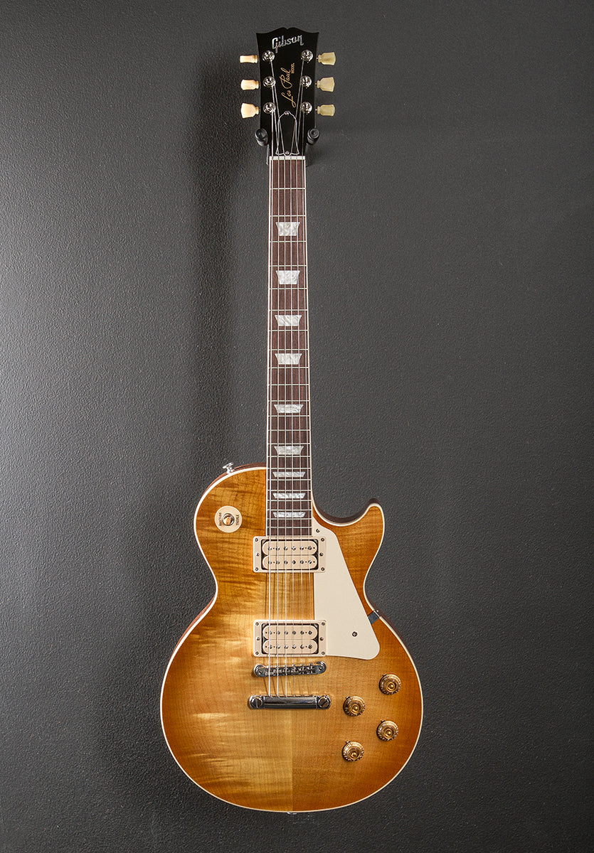 Vintage Honey Burst, Gloss nitrocellulose lacquer finish, AA figured Maple top on a solid Mahogany body, 50’s vintage shaped Mahogany neck, Bound 12” radius Rosewood fingerboard with the acrylic trapezoid inlays and medium jumbo frets, 24.75” scale length, 1.69″ nut width, Uncovered classic double white bobbin Burstbucker #2 bridge and Burstbucker #1 neck pickups, 3-way toggle switching with the volume and tone controls for each pickup, ABR-1 tune-o-matic bridge and aluminum stopbar tailpiece, Gibson vintage deluxe tuners, 9.2 pounds, With hardshell case