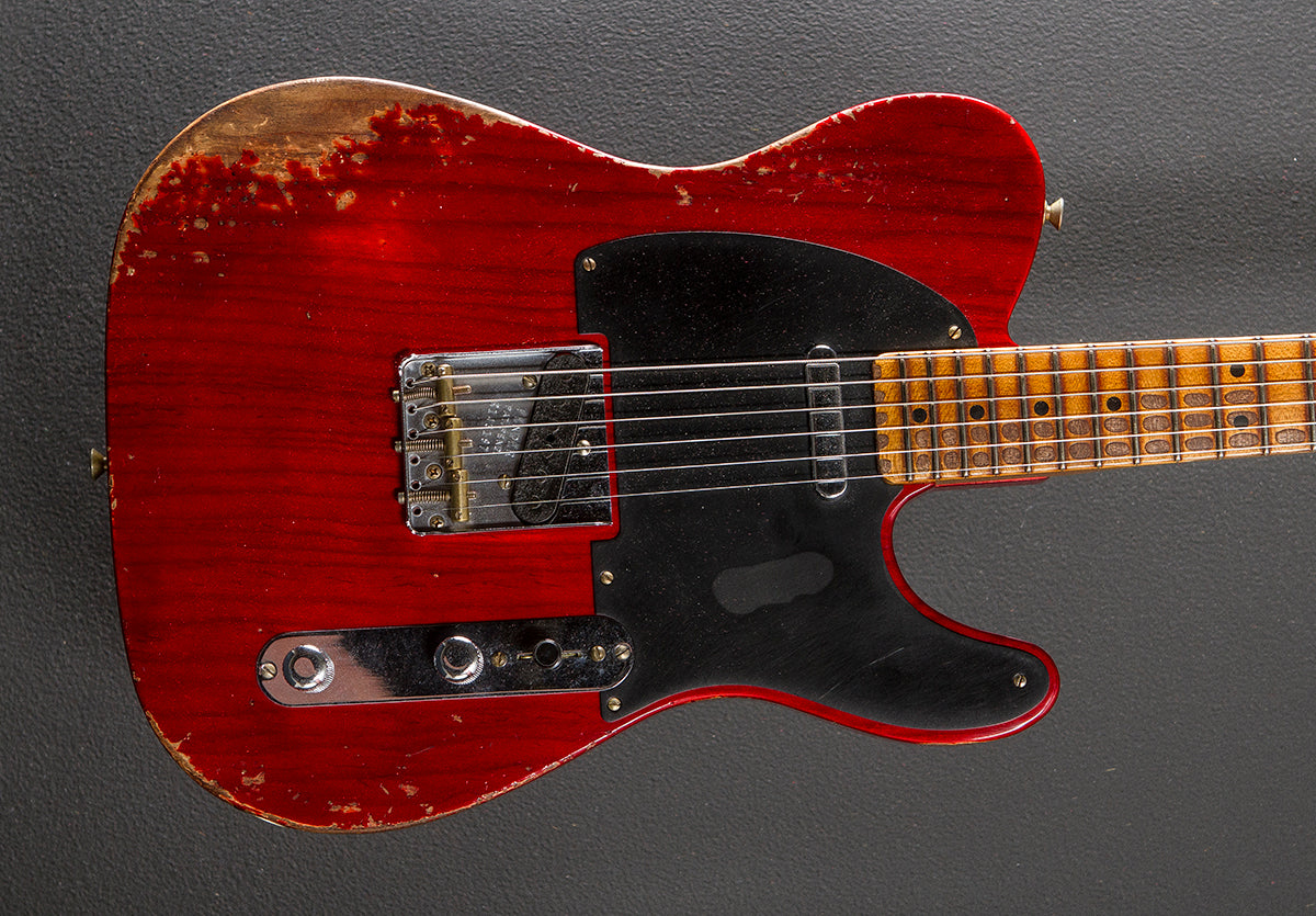 Crimson Red Transparent, Heavy aged nitrocellulose lacquer finish, Ash body, Nocaster U shaped 5/4 quartersawn Maple neck with a 9.5” radius Maple fingerboard and narrow tall frets, 25.5” scale length, 1 5/8th nut width, Handwound '50/'51 Blackguard Relic Tele bridge and neck pickups, 3-way switching with the master volume and tone controls, String thru body Tele bridge with the three brass barrel saddles, Fender vintage style tuners, The neck thickness is .95″ at the first and 1.01″ at the 12th frets, 7.0 pounds, With hardshell case