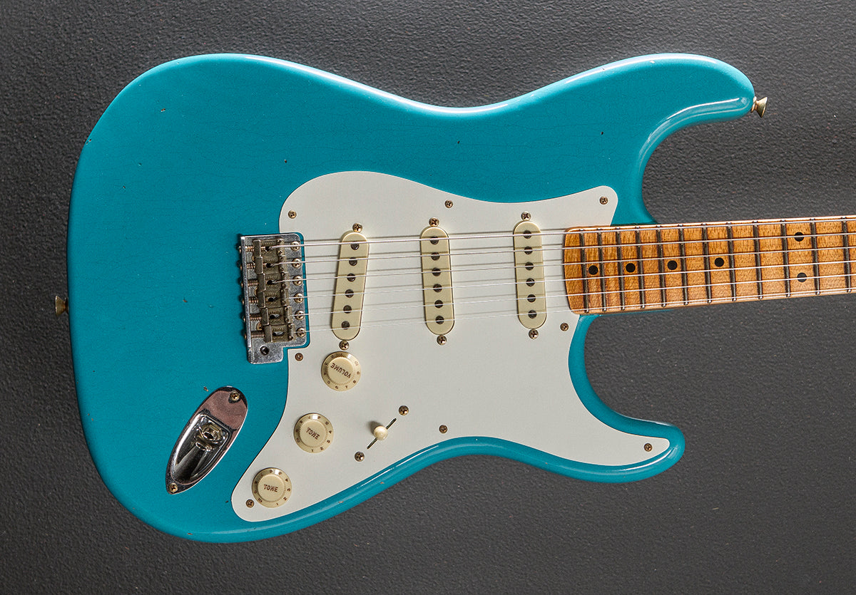 Taos Turquoise, Aged nitrocellulose lacquer finish, Ash body, 1957 soft V shaped 5/4 quartersawn Maple neck with a 9.5" radius Maple fingerboard and narrow tall frets, 25.5” scale length, 1 5/8th” nut width, Handwound Pablano Relic Strat pickups, 5-way switching with the volume/tone/tone controls, American Vintage tremolo with the bent steel saddles, Fender vintage style tuners, The neck thickness is .85″ at the first and 1.01″ at the 12th frets, 7.8 pounds, With hardshell case
