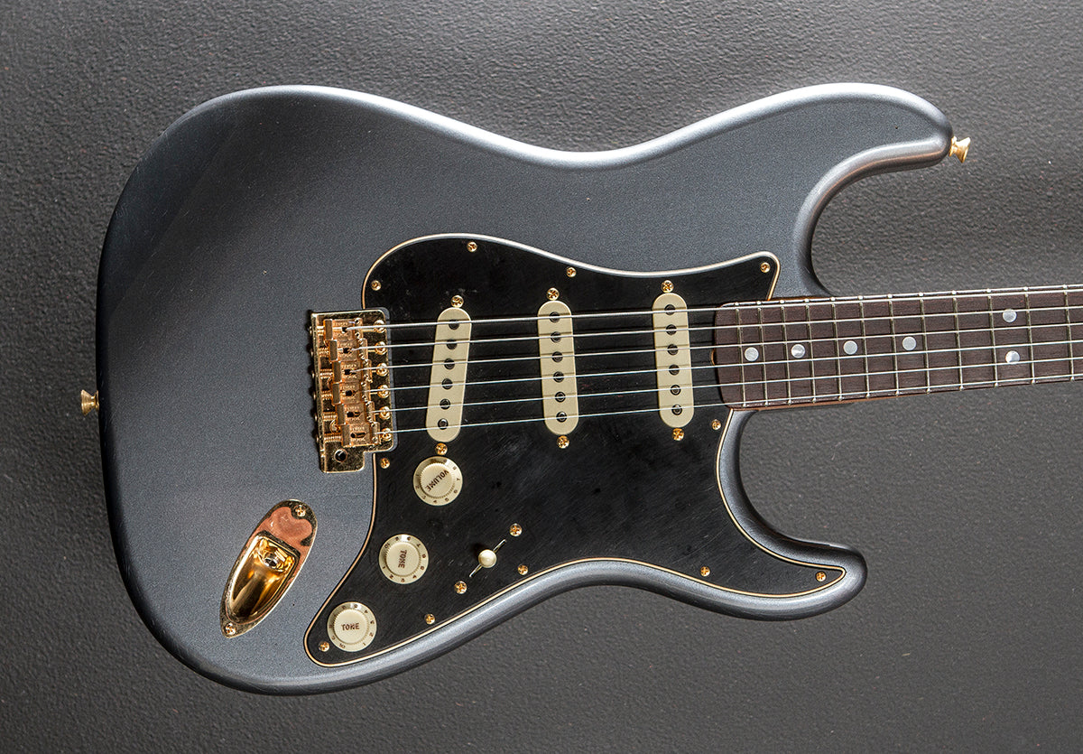 Charcoal Frost Metallic, Gold hardware, Light aged nitrocellulose lacquer finish, Alder body, 1965 C shaped 5/4 quartersawn Maple neck, 9.5" radius Rosewood fingerboard with the mother of pearl dot inlays and narrow tall frets, 25.5” scale length, 1 5/8th” nut width, Handwound Dual Mag II Strat pickups, 5-way switching with the volume/tone/tone controls, American Vintage tremolo with the bent steel saddles, Fender vintage style tuners, The neck thickness is .81″ at the first and .98″ at the 12th frets, 8.0 pounds, With hardshell case