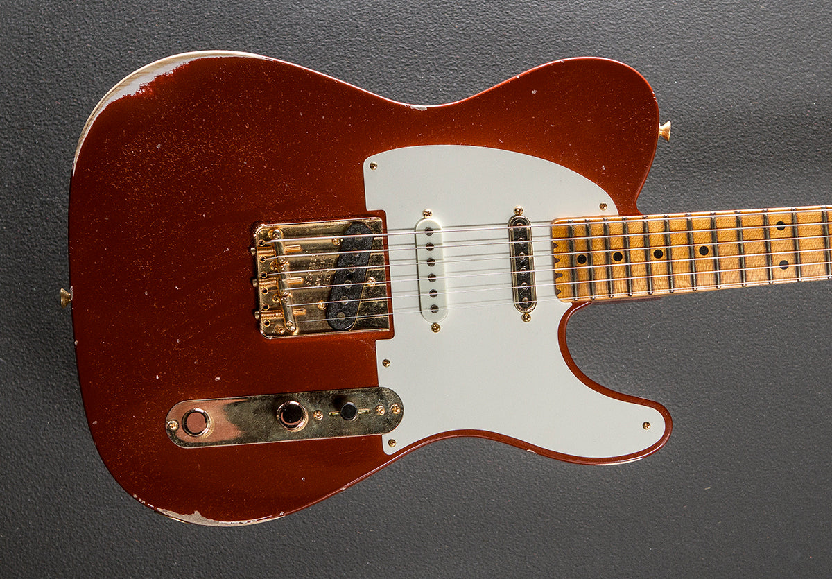 Cimarron Red over White Blonde, Aged nitrocellulose lacquer finish, Ash body, 1957 soft V shaped 5/4 quartersawn Maple neck with a 7.25" to 9.5” compound radius Maple fingerboard and narrow tall frets, 25.5” scale length, 1 5/8th nut width, Handwound Crushed Blackguard Tele bridge/Poblano Relic Strat middle/Tomatillo Relic Tele neck pickups, 5-way switching with the master volume and push/pull tone controls, String thru body Tele bridge with the three compensated brass barrel saddles, Fender vintage style tuners, The neck thickness is .85″ at the first and .96″ at the 12th frets, 7.0 pounds, With hardshell case