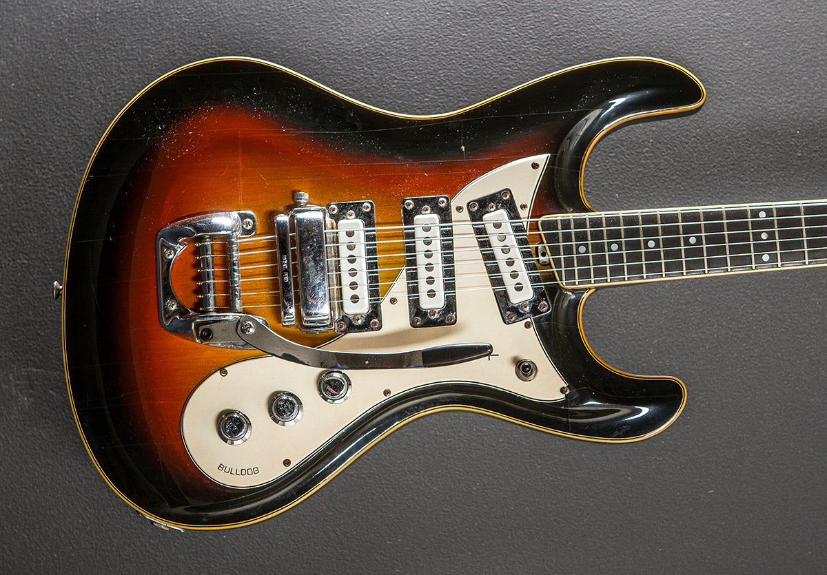 Sunburst, Made in Italy, Gloss body and neck finish, Mahogany body with the German carved top, Thin C shaped three piece Maple neck, Bound 10" radius Ebony fingerboard with the original low profile frets, 25" scale length, 1 5/8th" nut width, Vox single coil pickups, 3-way toggle switching with the volume/tone/tone controls, Original threaded roller saddle bridge w/string mute and vibrato tailpiece, Grover open gear tuners, The neck thickness is .83″ at the first and .94″ at the 12th frets, 8.4 pounds, With the original hardshell case, Very good