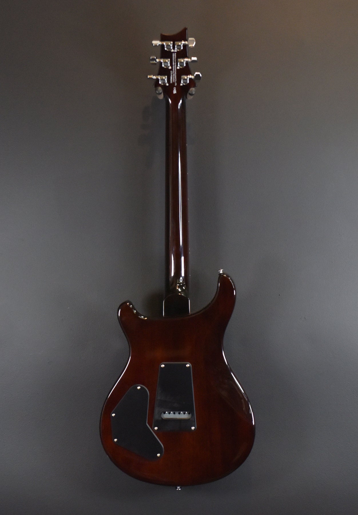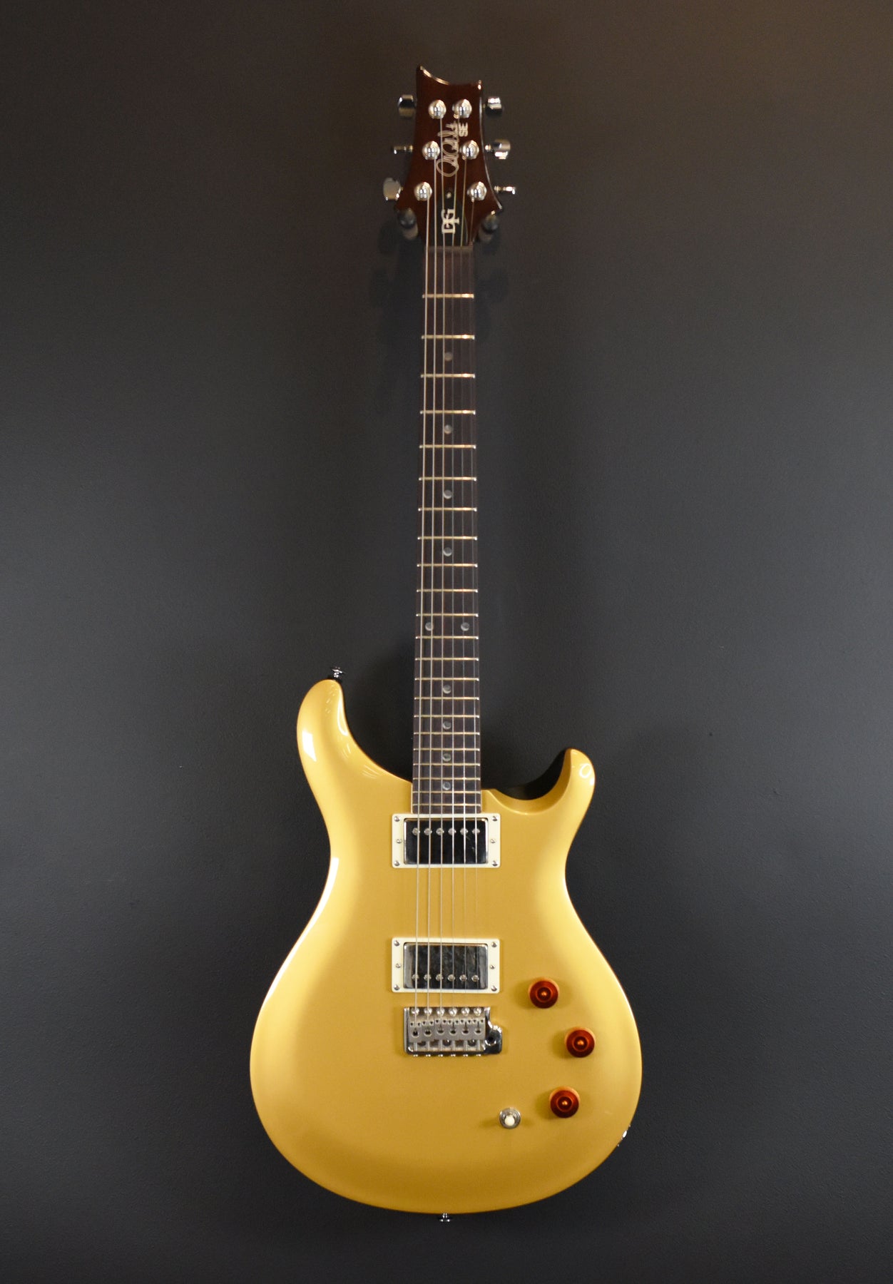 Gold Top, Shallow violin carved Maple top with a Flame Maple veneer, Mahogany body, DGT carved Mahogany neck, 10" radius Rosewood fingerboard with the Moon inlays, 25" scale length, 1 11/16th" nut width, DGT "S" bridge and neck pickups, 3-way toggle switching with the volume/volume and push/pull coil tap tone controls, PRS patented molded tremolo and PRS designed tuners, 7.6 pounds, with gig bag, Very Good.