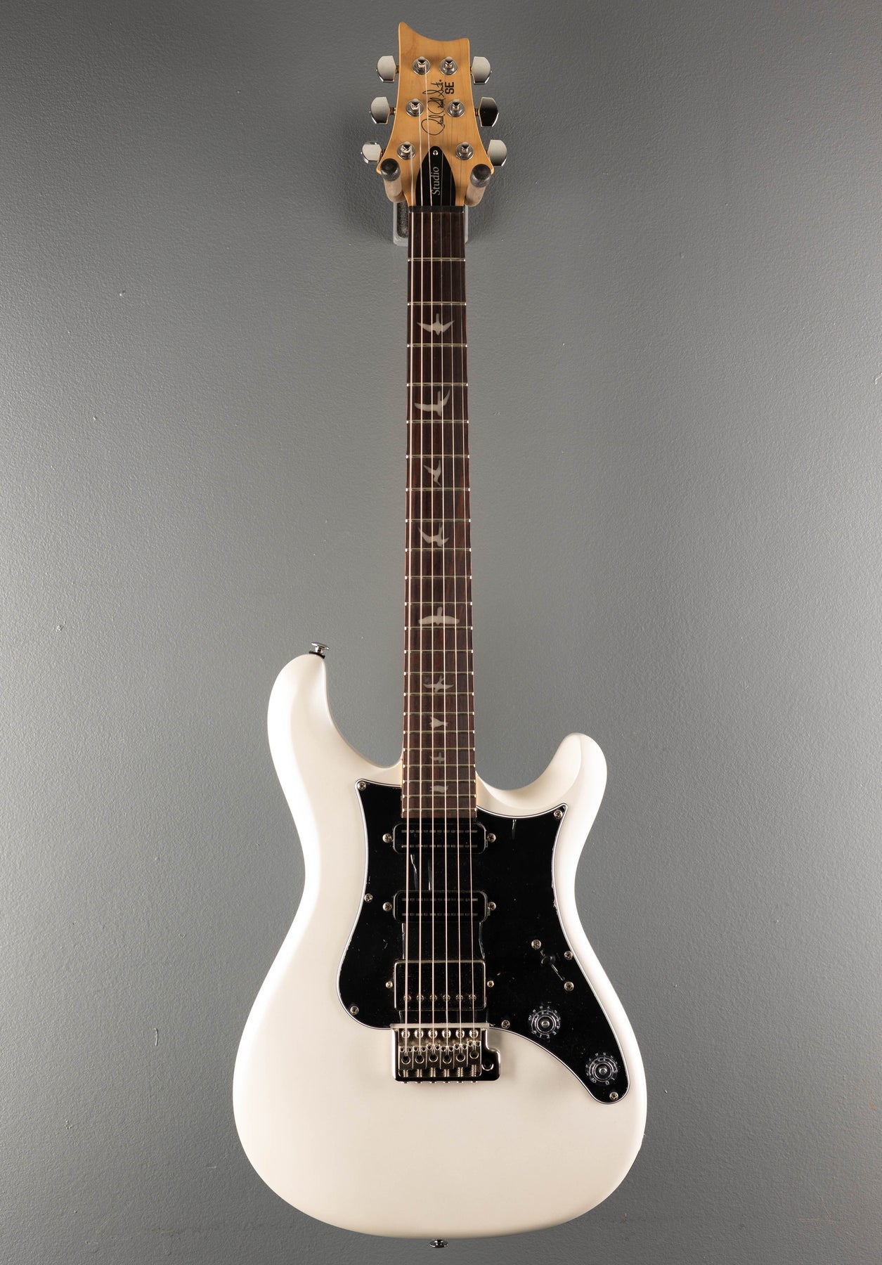 Very Good Condition, White Pearl, Flat Top Mahogany body, 10" radius Rosewood fingerboard with bird inlays on a Wide Thin carved Maple neck, 1 11/16" nut width, 25" scale length, 58/15 “S” bridge and Narrowfield DD “S” Neck/Middle pickups, 5 way switching with volume and push pull coil tap tone controls, PRS Patented Tremolo and PRS Designed Tuners, 7.4 pounds, comes with gig bag.