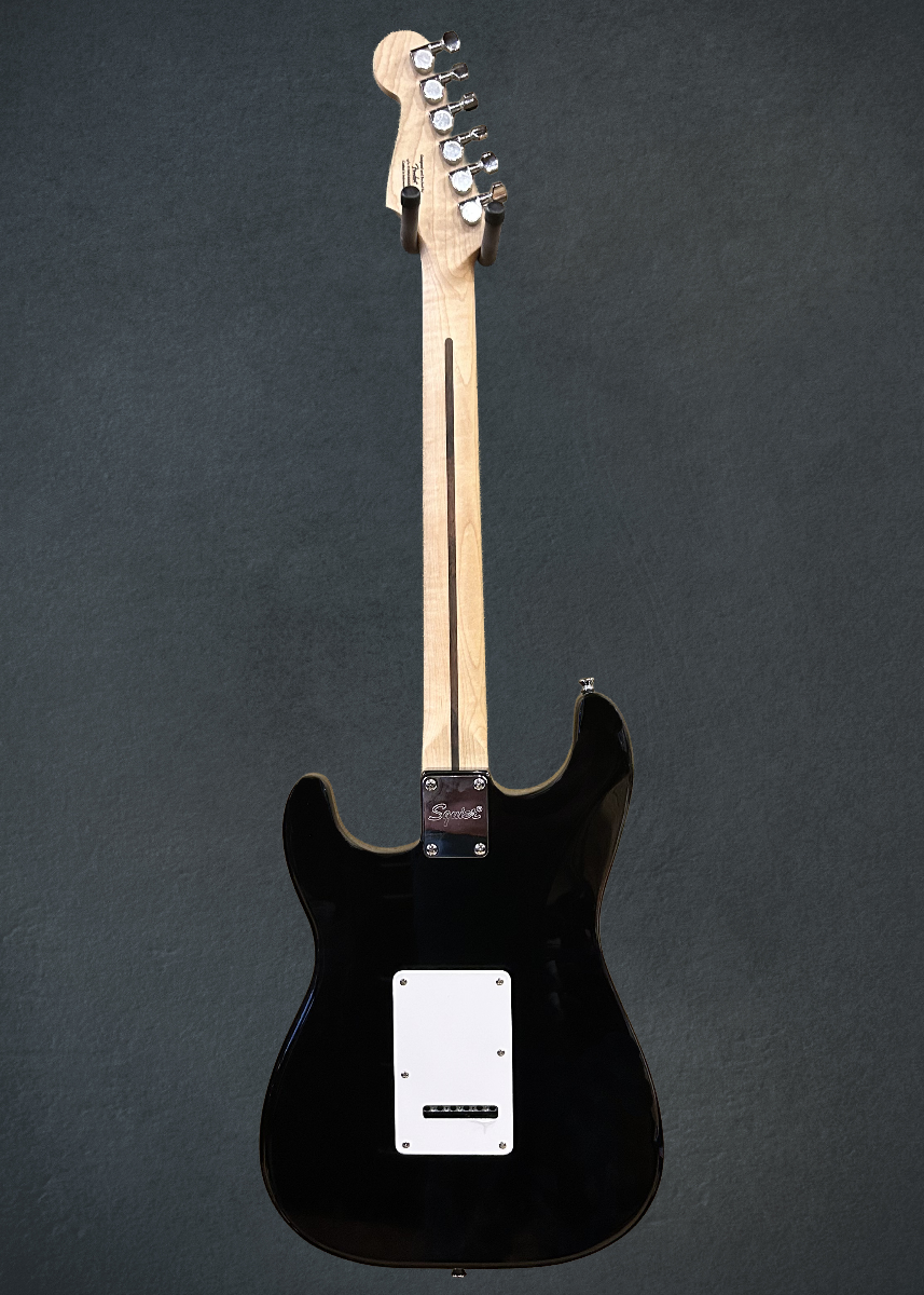 Black, Crafted in Indonesia, Poplar body, Gloss polyurethane body finish, C shaped Maple neck with a 9.5” radius Maple fingerboard and narrow tall frets, 25.5" scale length, 1.650" nut width, Ceramic single coil pickups, 5-way switching with the master volume, tone 1. (neck/middle pickups) and tone 2. (bridge pickup) controls, Vintage style synchronized tremolo with the block saddles, Cast/sealed tuners, Case not included