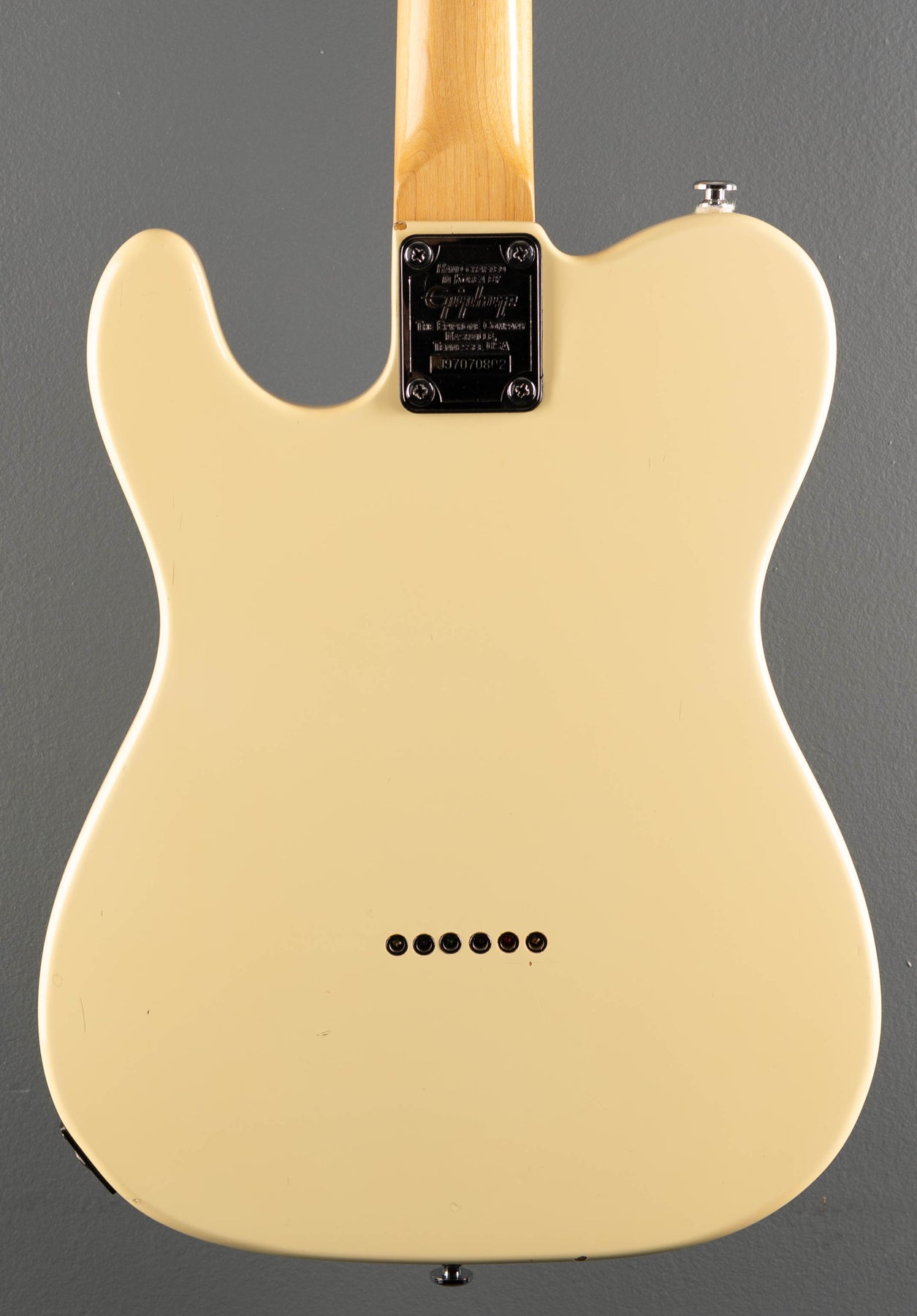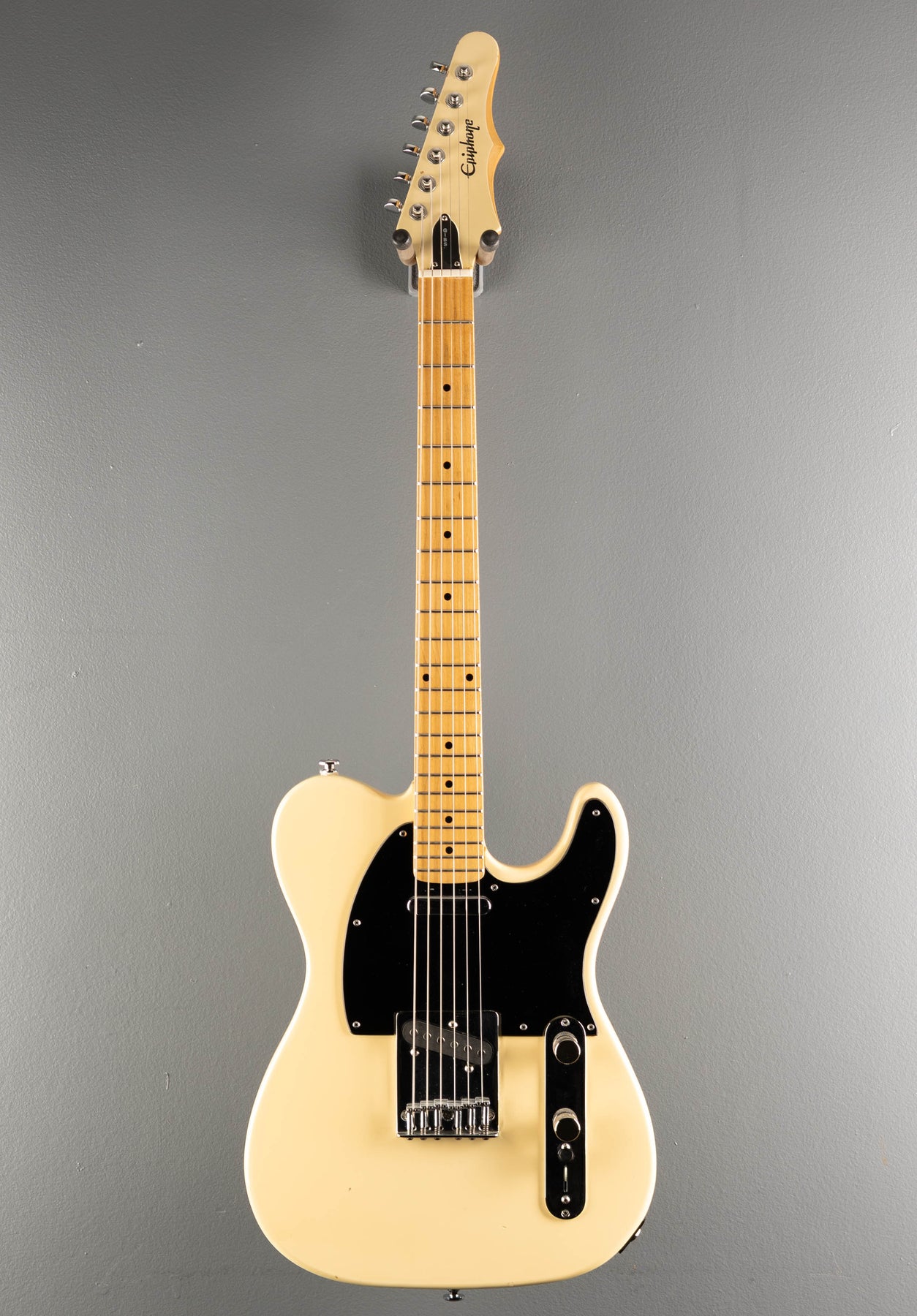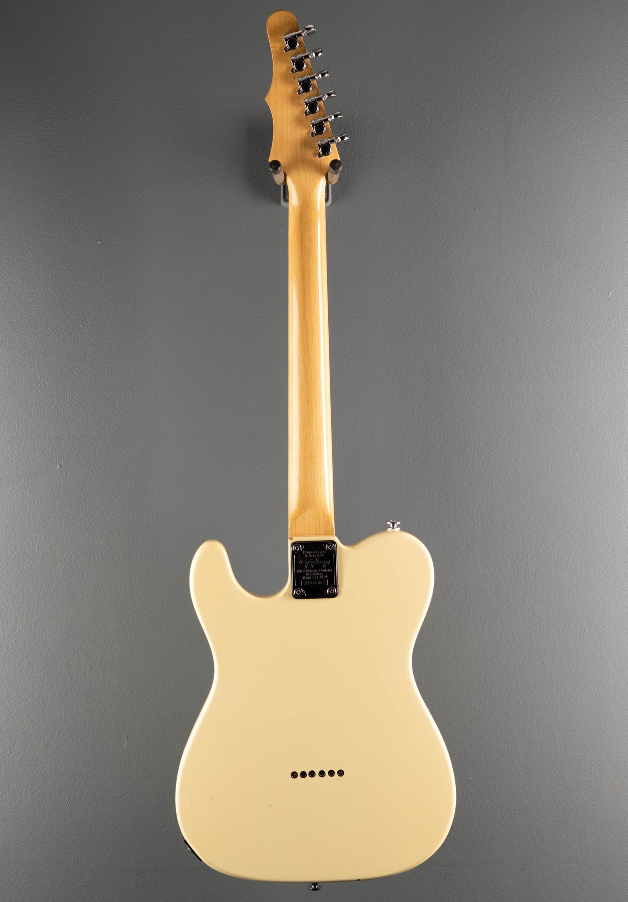 Very Good condition, Aged White, Gloss finish, Ash body, One-piece Maple neck with a Maple fingerboard and Black Dot inlays, 25.5" scale length, 1 5/8" nut width, Stock single-coil neck pickup and TV Jones Starwood Tele bridge pickup with 3-way switching, Master Volume and Tone controls, Grover tuners, String-through-body bridge with six barrel saddles, 7.5 pounds, No case included.