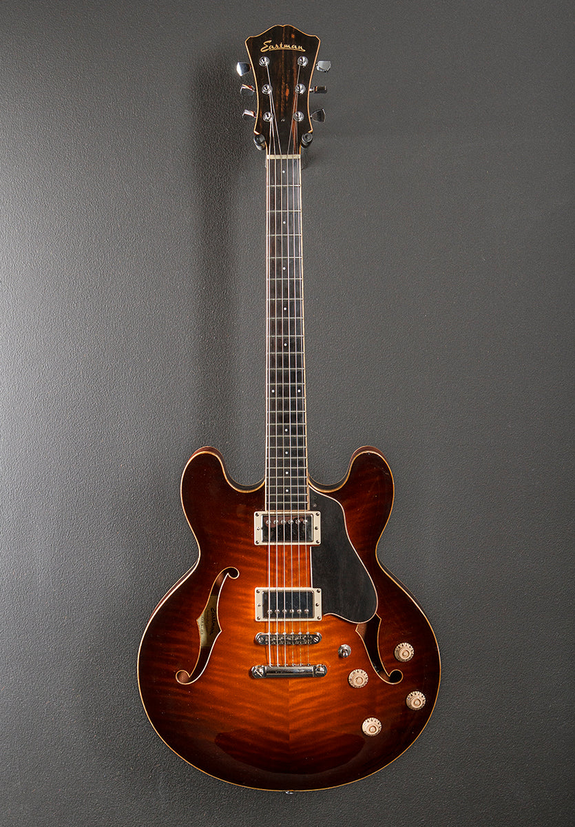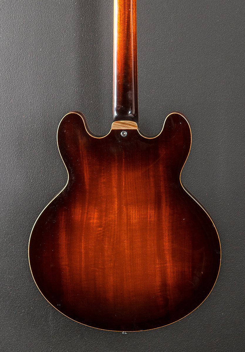 Sunburst, Serial number 4581, Gloss finish, Hollow body with a solid Maple top and solid Mahogany back/sides, Flame Maple binding, 12” radius Ebony fingerboard with the pearl dot inlays on a traditional even C shaped Mahogany neck, 25” scale length, 1 3/4” nut width, Newer Gibson Lead Pro bridge and Burstbucker #1 neck pickups were installed, 3-way toggle switching with the volume and tone controls for each pickup, Gotoh tune-o-matic bridge and stop tailpiece, Gotoh cast/sealed tuners, The neck thickness is .83″ at the first and .88″ at the 12th frets, 6.8 pounds, With hardshell case, Very good