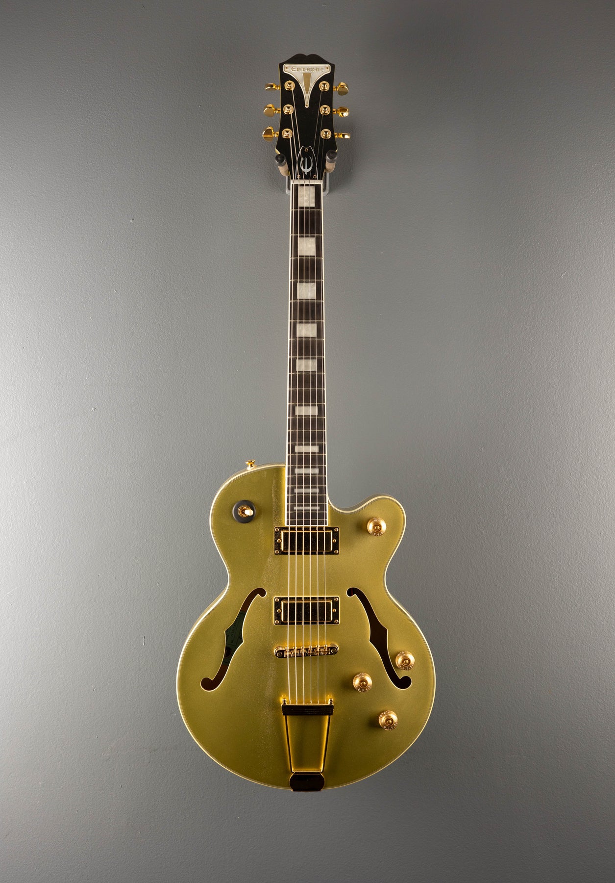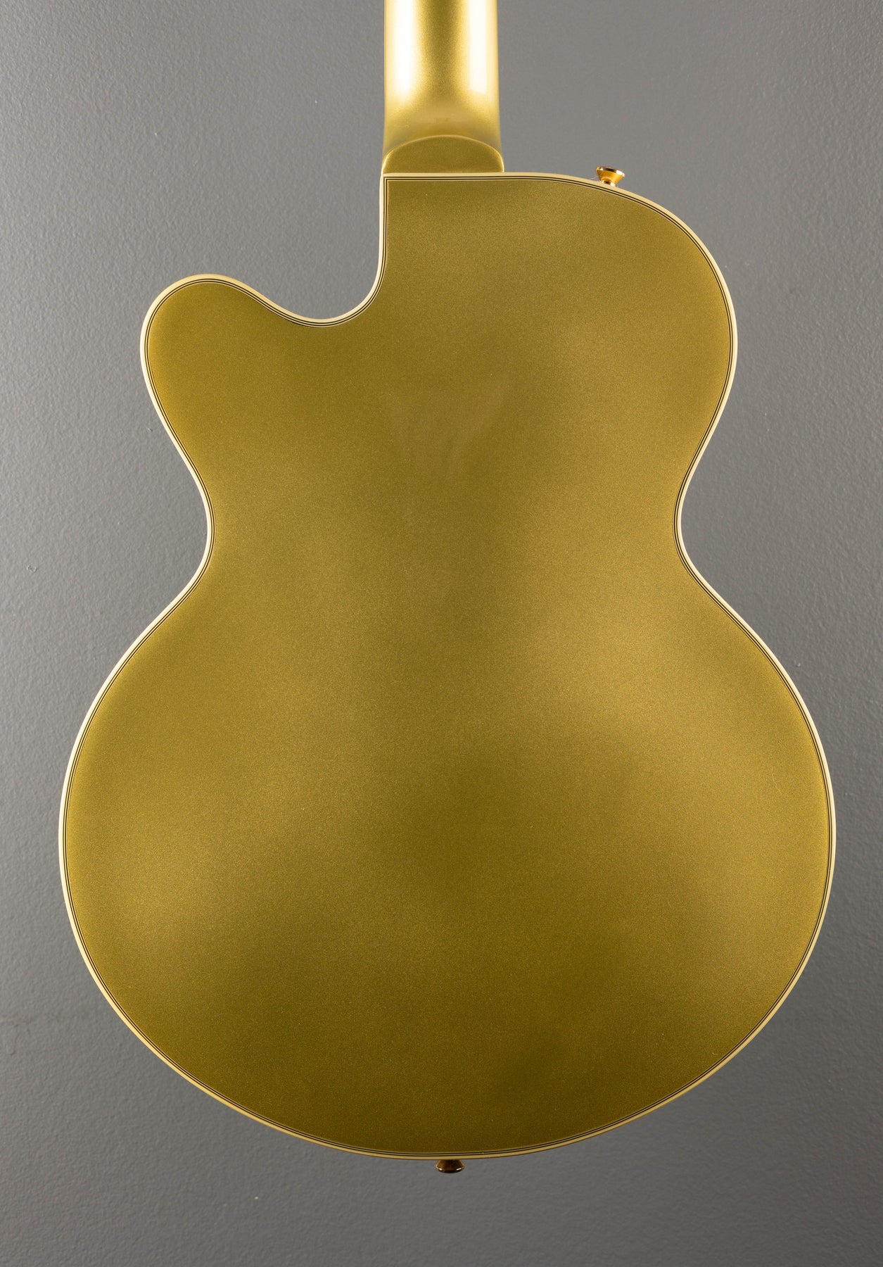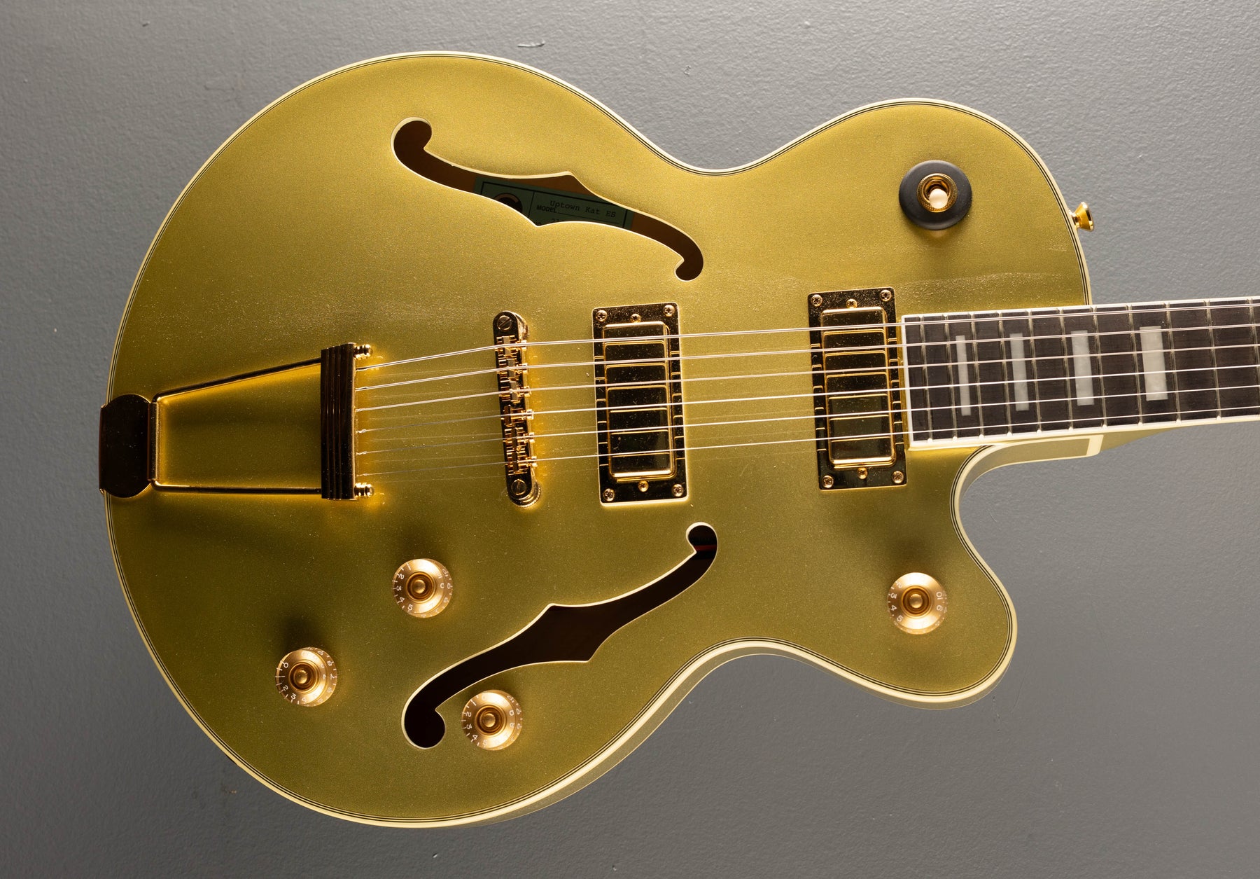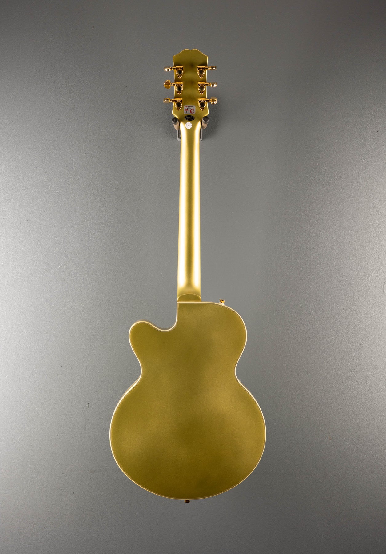 Very Good Condition, Topaz Gold Metallic, Gloss finish, Semi-hollow 5-ply Maple/Poplar body with a centerblock, Slim taper C shaped Mahogany neck, Bound 12” radius Ebony fingerboard with the pearloid block inlays and medium jumbo frets, 24.75” scale length, 1.69” nut width, Epiphone Mini-ProBucker FB720 bridge and neck pickups, 3-way toggle switching with the master volume and tone controls plus a volume control for each pickup, Epiphone LockTone tune-o-matic bridge and trapeze tailpiece, Grover Rotomatic tuners, 7.1 pounds, Case not included.