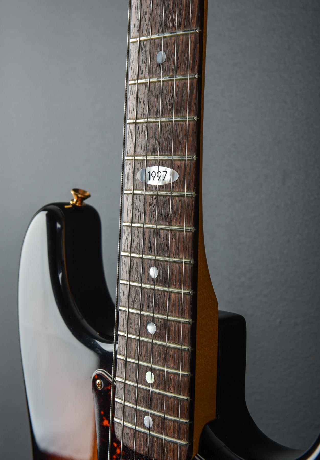 Three Color Sunburst, Alder body, Gloss nitrocellulose lacquer finish, C shaped Maple neck with a 7.25" radius Rosewood fingerboard and medium jumbo frets, 25.5" scale length, 1.650" nut width, Texas Special Strat pickups, 3-way switching with the master volume, tone 1. (neck pickup) and tone 2. (middle pickup) controls, Gold plated hardware, Vintage style synchronized tremolo with the bent steel saddles, Vintage-Style tuners, 7.5 pounds,  With original hardshell case