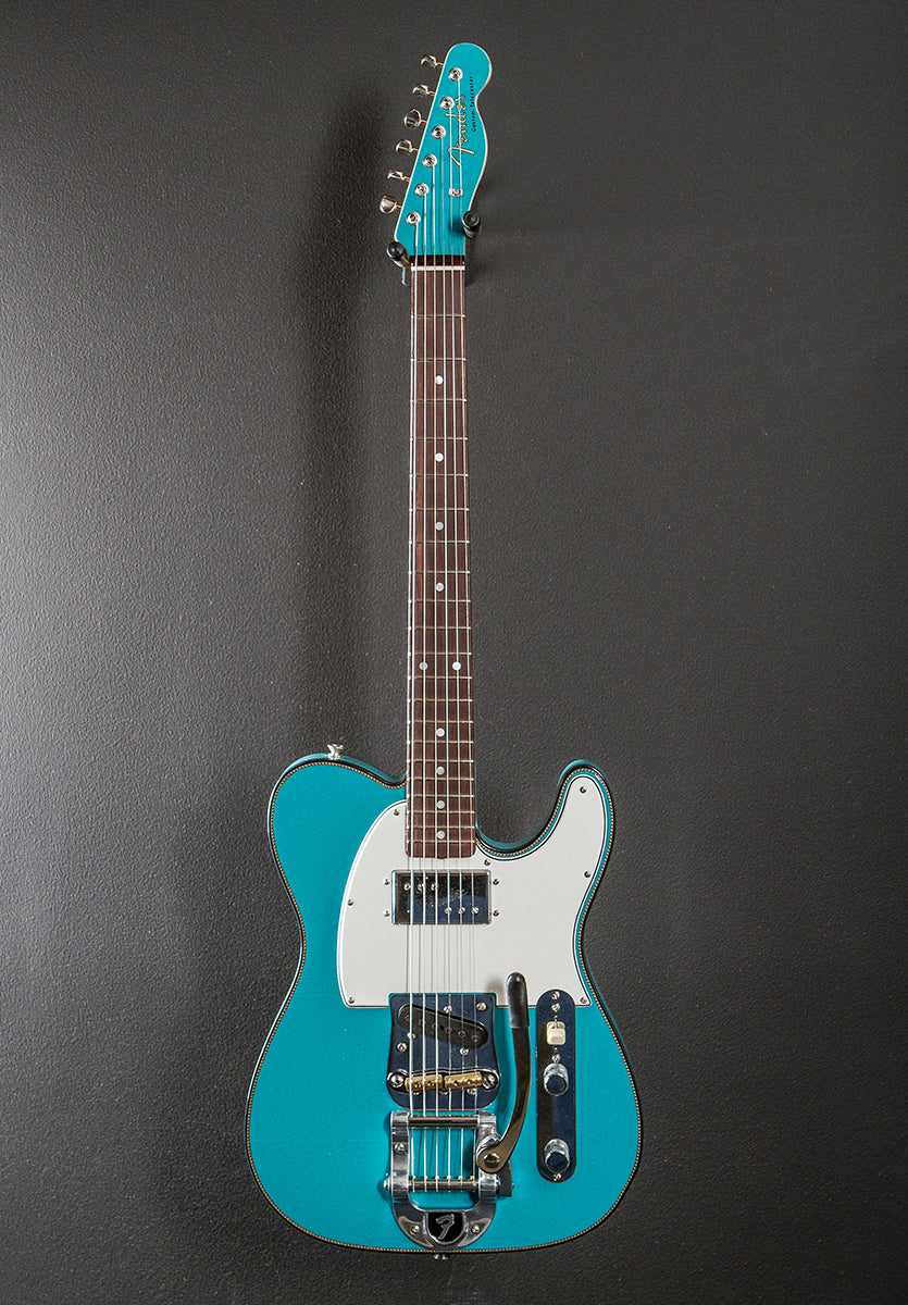 Taos Turquoise with the matching headstock, NOS flash coat nitrocellulose lacquer finish, Alder body, Black top and back binding with the Rope top inlay, 1960 oval C shaped 5/4 quartersawn Maple neck, 9.5" radius Rosewood fingerboard with the mother of pearl dot inlays and narrow tall frets, 25.5” scale length, 1 5/8th” nut width, Handwound Original Broadcaster bridge and Wide Range humbucking CUNIFE neck pickups, 3-way switching with the master volume and tone controls, RSD bridge with the two brass adjustable saddles and Bigsby B5 vibrato, Fender vintage style tuners, The neck thickness is .80″ at the first and .94″ at the 12th frets, 8.6 pounds, With the certificate and Fender hardshell case, Very good