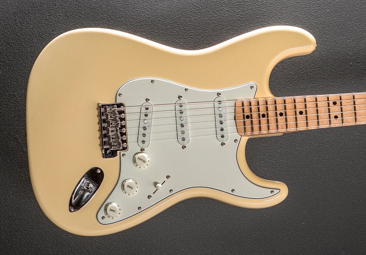 Vintage White, Gloss nitrocellulose lacquer body finish, Alder body, Gloss polyurethane finished C shaped Maple neck with a scalloped 9.5" radius Maple fingerboard and super jumbo frets, 25.5" scale length, 1 5/8th" wide brass nut, Seymour Duncan YJM Fury Strat STK-S10B bridge and Seymour Duncan YJM Fury Strat STK-S10N middle/neck pickups, 5-way switching with the volume/tone/tone controls, American Vintage synchronized tremolo with the bent steel saddles, Fender F stamped tuners, The neck thickness is .77″ at the first and .84″ at the 12th frets, 8.0 pounds, With the certificate and Fender hardshell case, Excellent