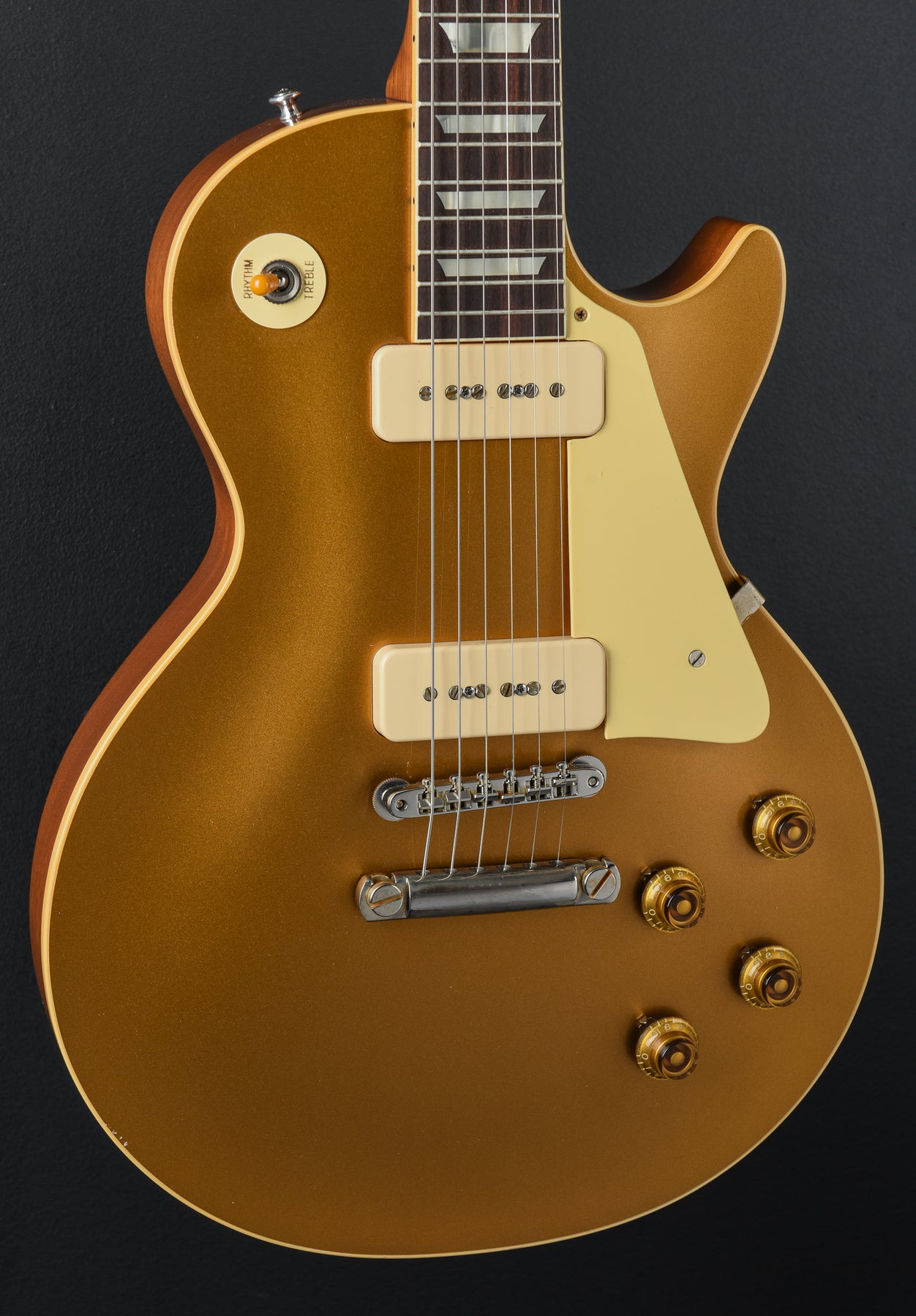 Goldtop, VOS Nitrocellulose Lacquer Finish, Two-Piece Carved Plain Maple Top on a One-Piece Lightweight Mahogany Body, Hide Glue Construction with Long Tenon Neck Joint, 50’s Rounded Medium C Shaped Mahogany Neck, Bound 12” Radius Indian Rosewood Fingerboard with Cellulose Nitrate Trapezoid Inlays and Historic Narrow Tall Frets, 24.75” Scale Length, 1.69” Nut Width, Custom Soapbar P-90 Bridge and Neck Pickups, 3-Way Toggle Switching with Volume and Tone Controls for Each Pickup, No-Wire ABR-1 Tune-O-Matic Bridge and Lightweight Aluminum Stop Tailpiece, Kluson Single Line / Single Ring Tuners, 8.1 Pounds, Comes with a Lifton Hardshell Case.