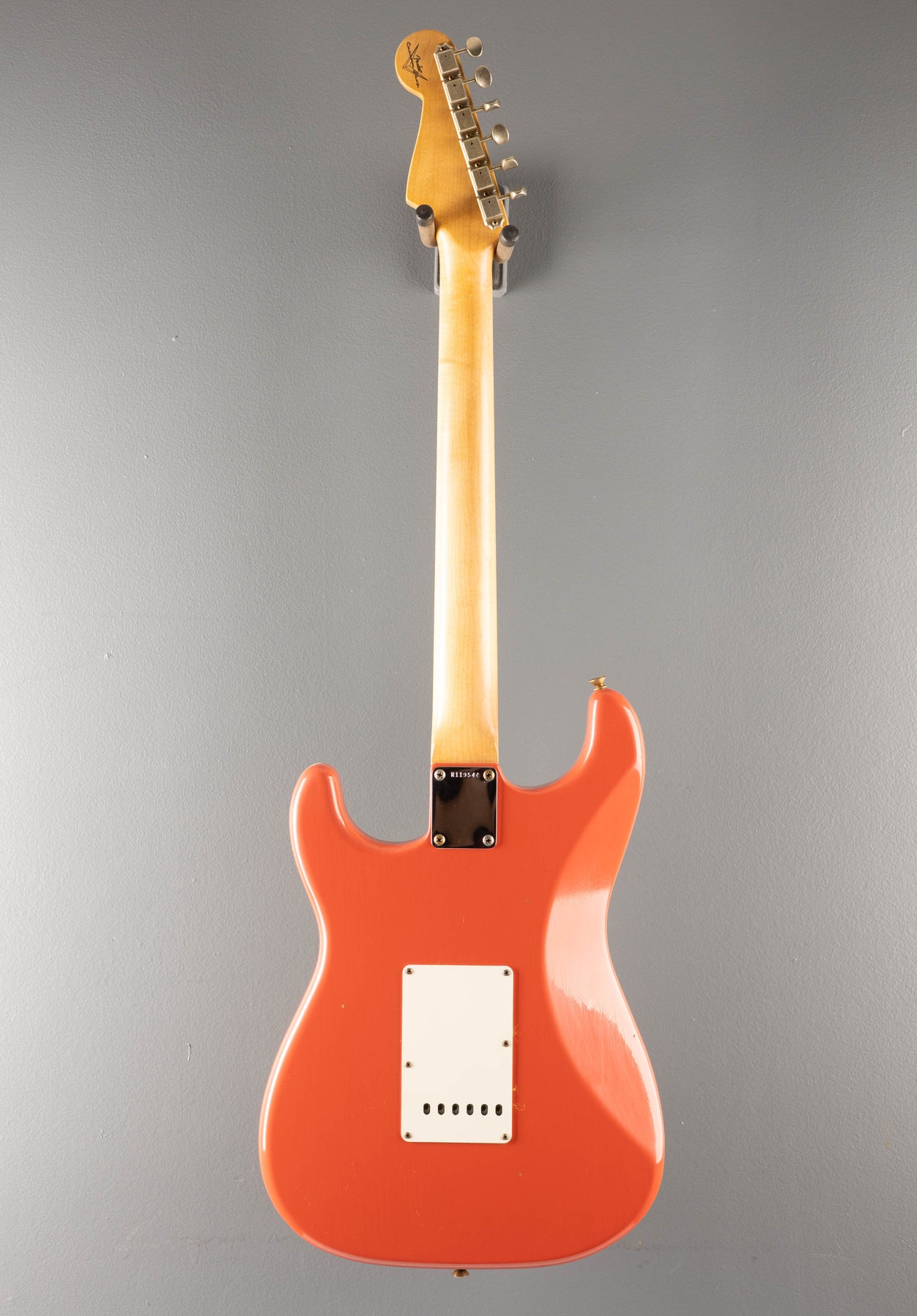 Tahitian Coral, Alder body, Mid 60's Oval C shaped Maple neck with a 9.5″ radius AAA Rosewood fingerboard and medium jumbo frets, 25.5" scale length, 1.650" nut width, Handwound 1960 Relic Strat pickups, 5-way switching with the vintage mod #1 wiring, 7.7 pounds, With Fender Custom Shop hardshell case.
