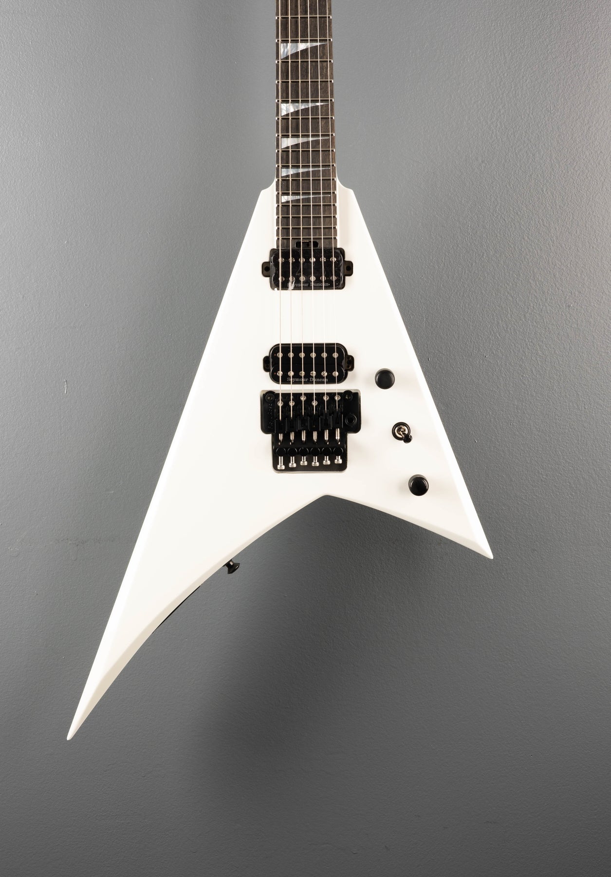 Snow White, Alder body, 12"-16" compound radius Ebony fingerboard with Inverted Mother of Pearl Sharkfin inlays and Jumbo Stainless Steel frets on a 3 piece Maple Speed neck with Graphite Reinforcement, 1.6875" nut width, 25.5" scale length, the neck measures .77" at the 1st and .86" at the 12th frets, Seymour Duncan TB-4 JB Bridge and SH-1N '59 neck pickups, 3 way switching with volume and tone controls, Floyd Rose 1500 Series Double-Locking Tremolo bridge, Gotoh MG-T Locking Tuners, 7.7 pounds, comes with foam core case.