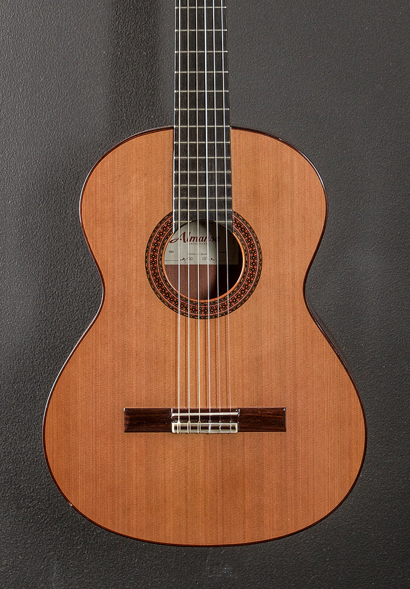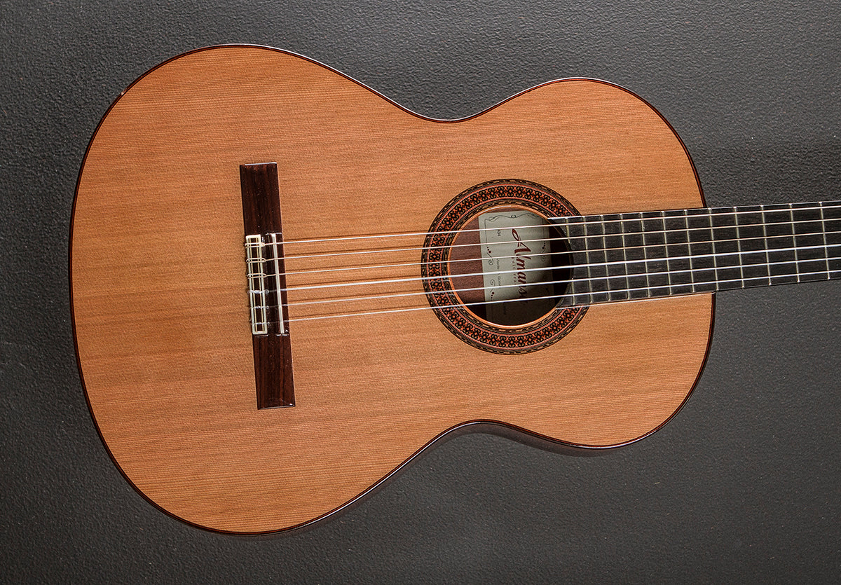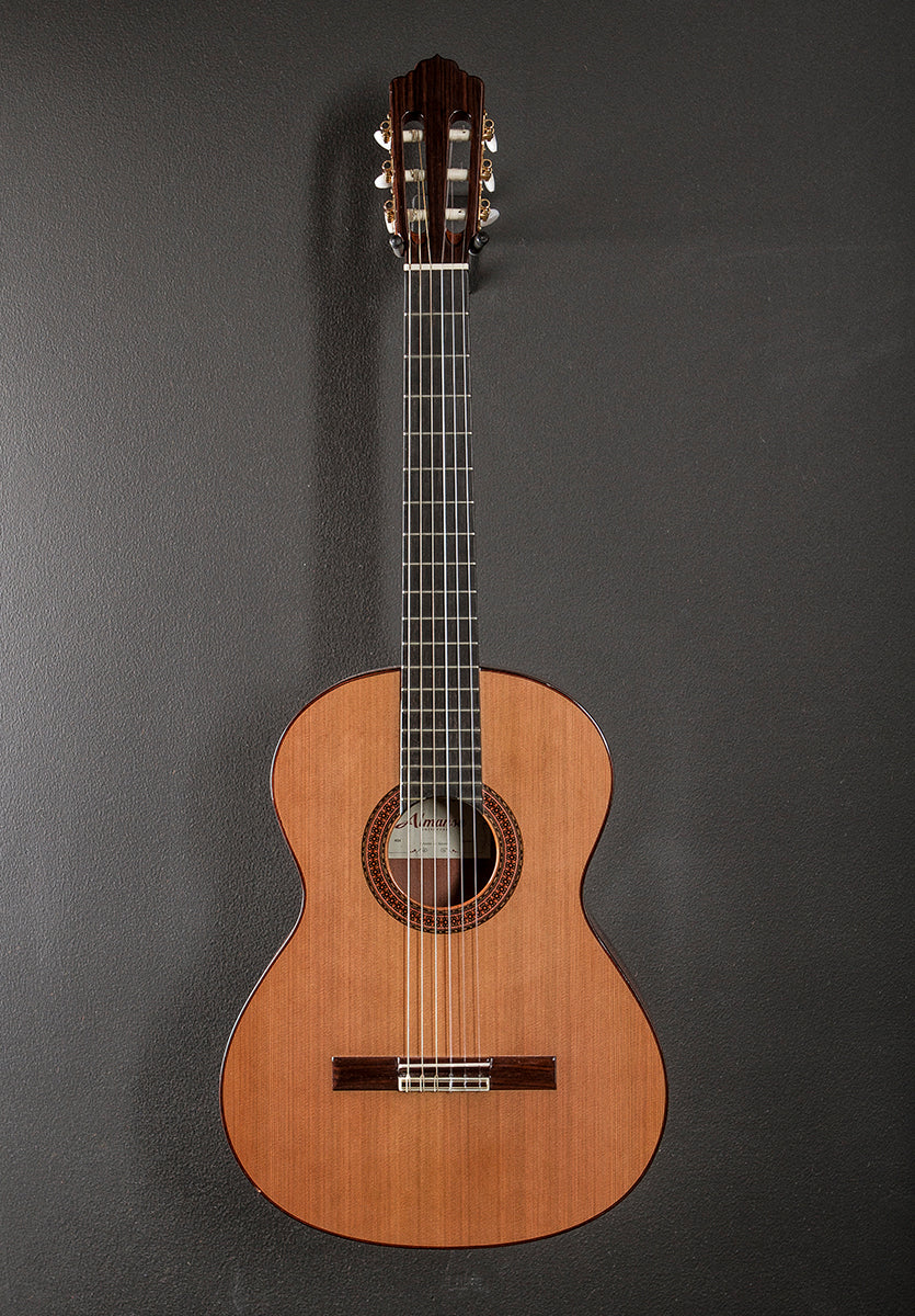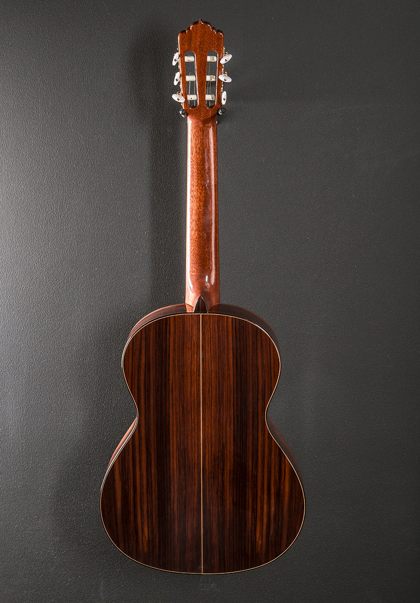Natural, Made in Spain, Gloss finish, Conservatory series body shape, Solid Red Cedar top, Mosaic Rosette, Indian Rosewood back and sides, Rosewood binding, D shaped Mahogany neck with a flat Ebony fingerboard and narrow tall frets, 25.6" scale length, 2 1/16th" nut width, Strip tuners, The neck thickness is .83″ at the first and .94″ at the 9th frets, With hardshell case, Very good