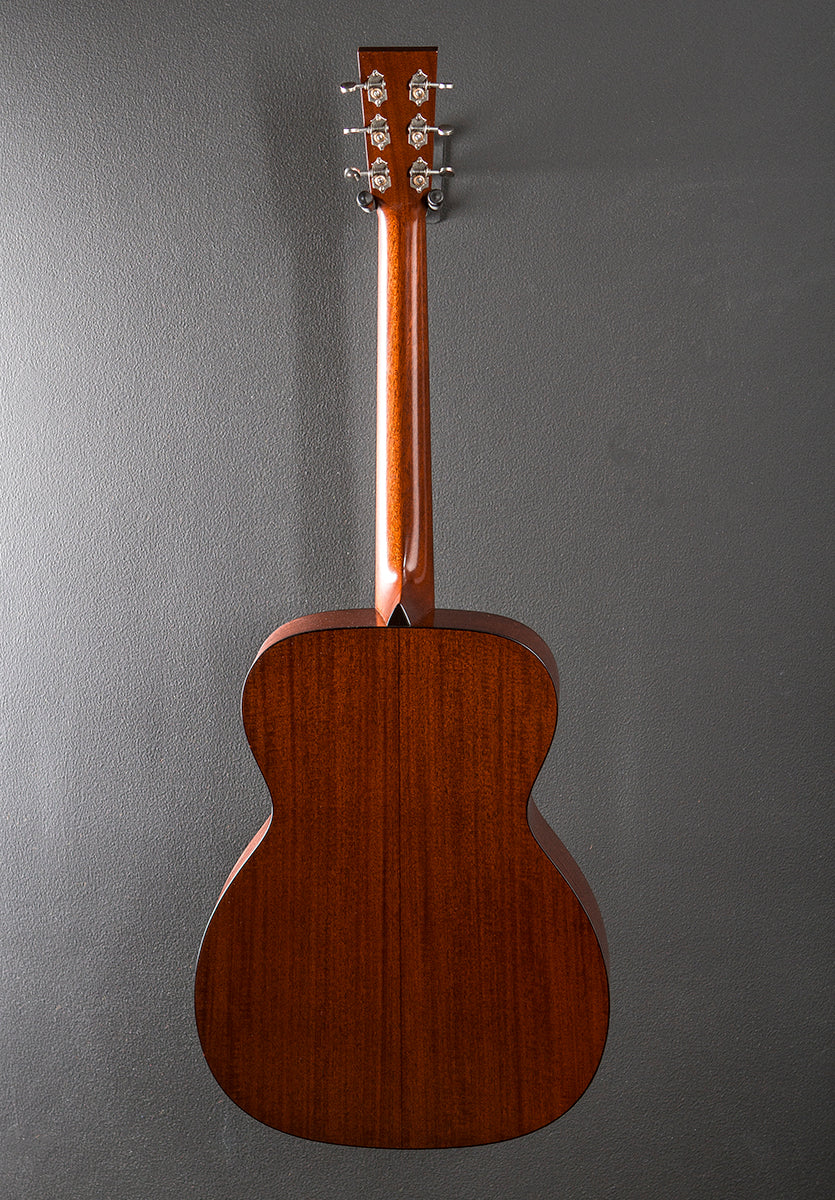 Natural, Serial number 33464, 14-Fret Orchestra Model body shape, Custom satin nitrocellulose lacquer finish, Optional Adirondack Spruce top, Custom Wood Rosette, Custom traditional series pre-war scalloped X bracing w/no tongue brace, Honduran Mahogany back and sides, 1-style Walnut backstrip, Tortoise binding with the custom wood purflings, Custom Julian Lage shaped Honduran Mahogany neck, 14” to 26” compound radius Ebony fingerboard with the Mother of Pearl short Dot inlays and medium frets, 25.5” scale length, 1 11/16th” nut width, Relic nickel Waverly tuners with the vintage oval buttons, With hardshell case