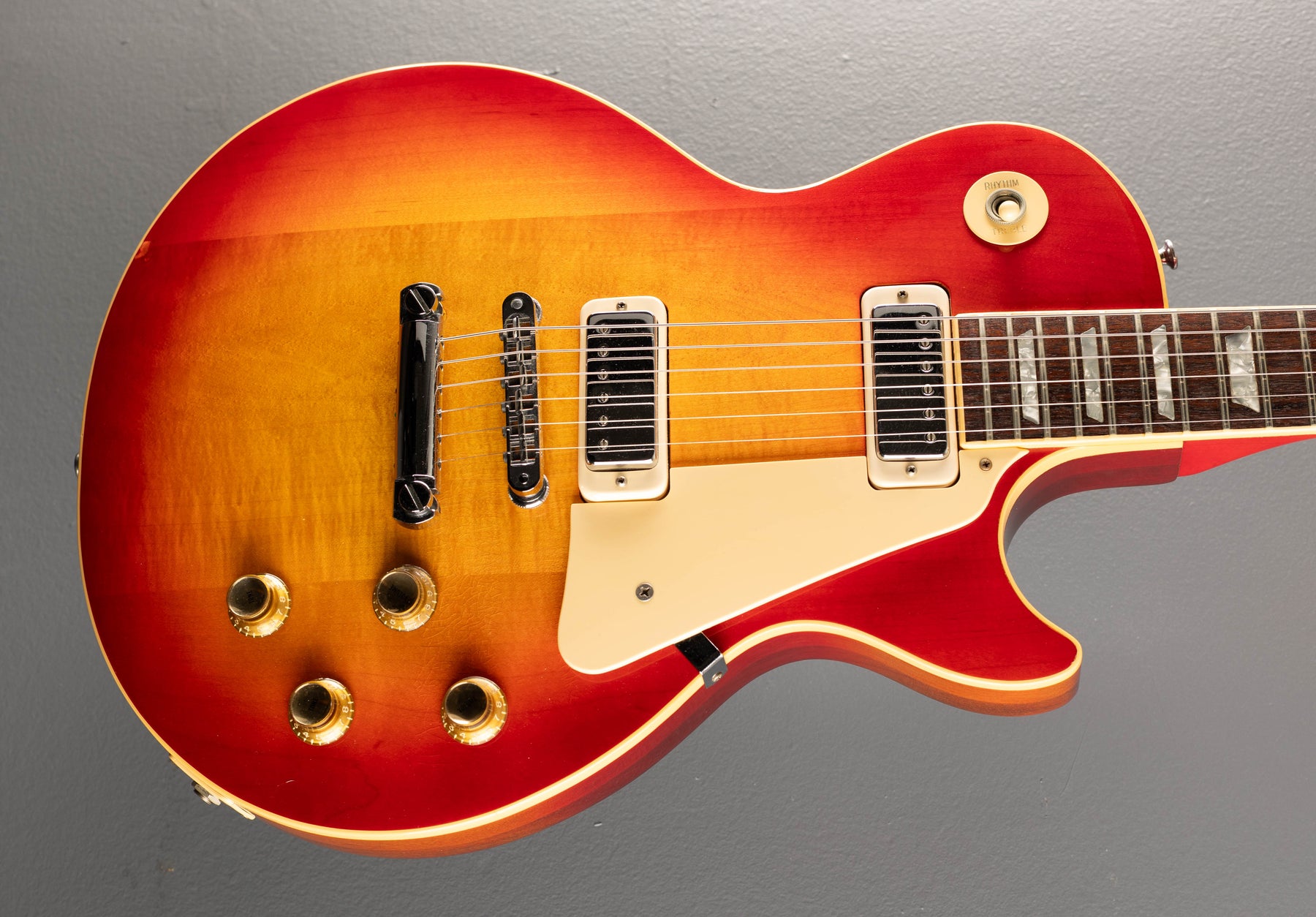 Very Good condition, Cherry Sunburst, Three piece Maple top, Mahogany “pancake” body, Slim C shaped three piece Maple neck with the small volute, Bound 12" radius Rosewood fingerboard and the original medium frets, 24.75" scale length, 1 11/16th" nut width, Gibson Patent No. Stamped mini humbucker pickups, 3-way toggle switching with the volume and tone controls for each pickup, Nashville Bridge with the stop bar tailpiece, Gibson Deluxe tuners, 10.9 pounds, With the hardshell case.