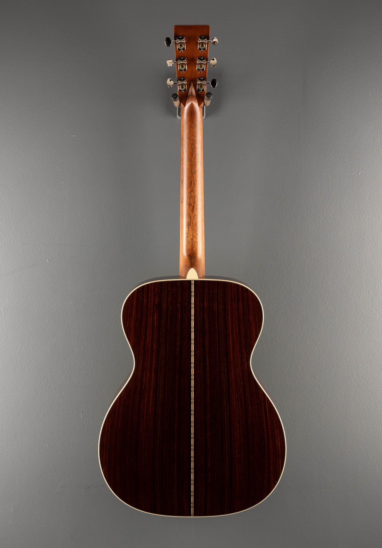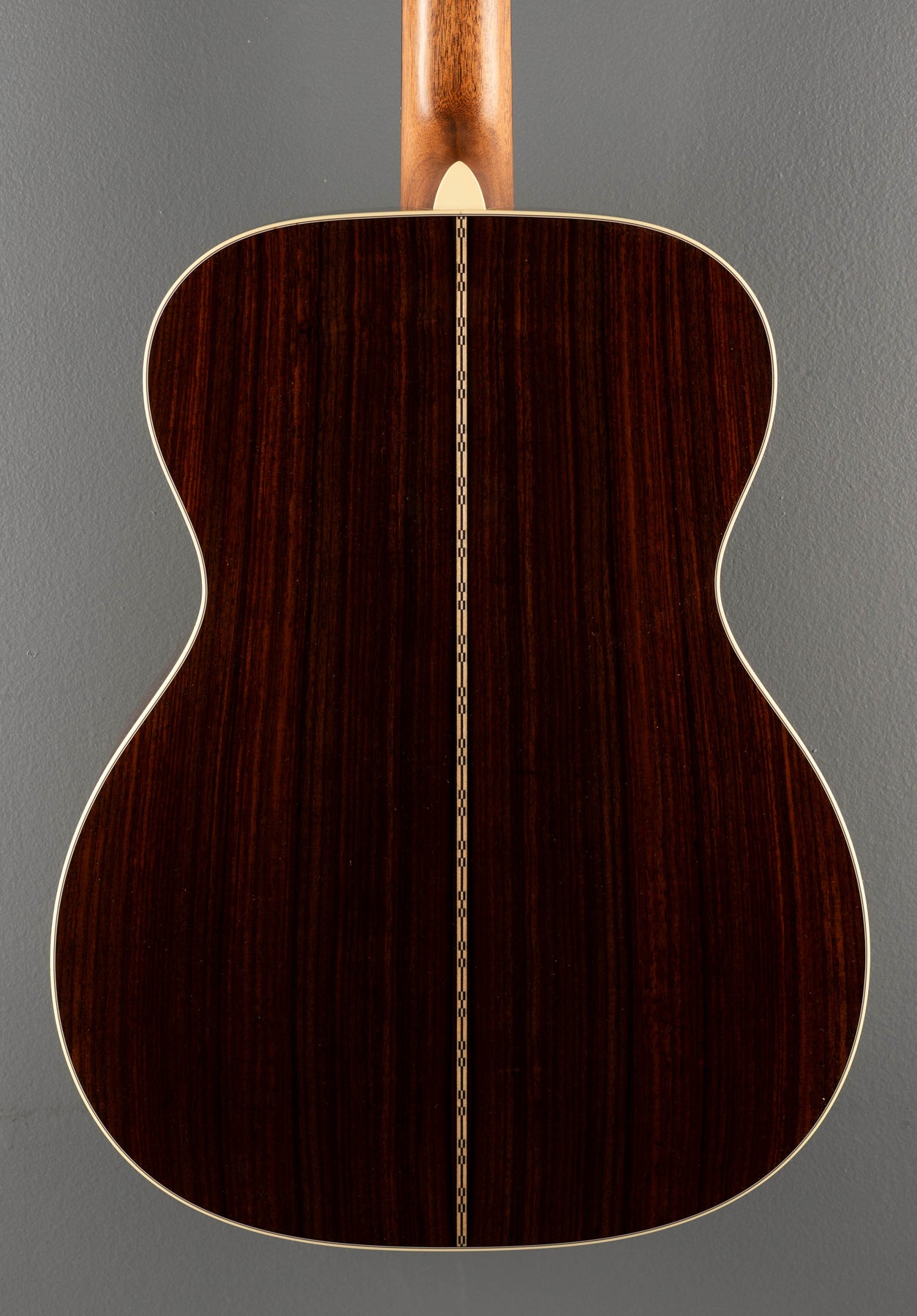 Natural, 000-14 Fret body shape, Solid Spruce top, GE Scalloped X bracing, Style 28 Multi-stripe Rosette, Antique White binding with the Bold Herringbone top and multi-stripe back inlay, East Indian Rosewood back and sides, Style 28 back purfling, Ebony fingerboard with the Abalone long pattern Diamond and Squares position markers on a GE Modified Low Oval w/high performance taper shaped select hardwood neck, 24.9″ scale length, 1 3/4” width at the nut, With hardshell case