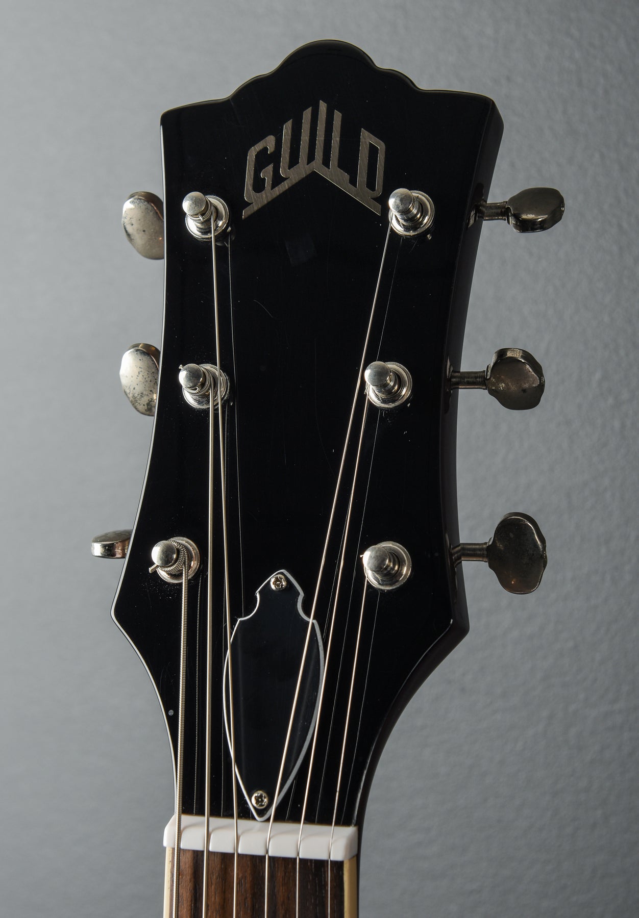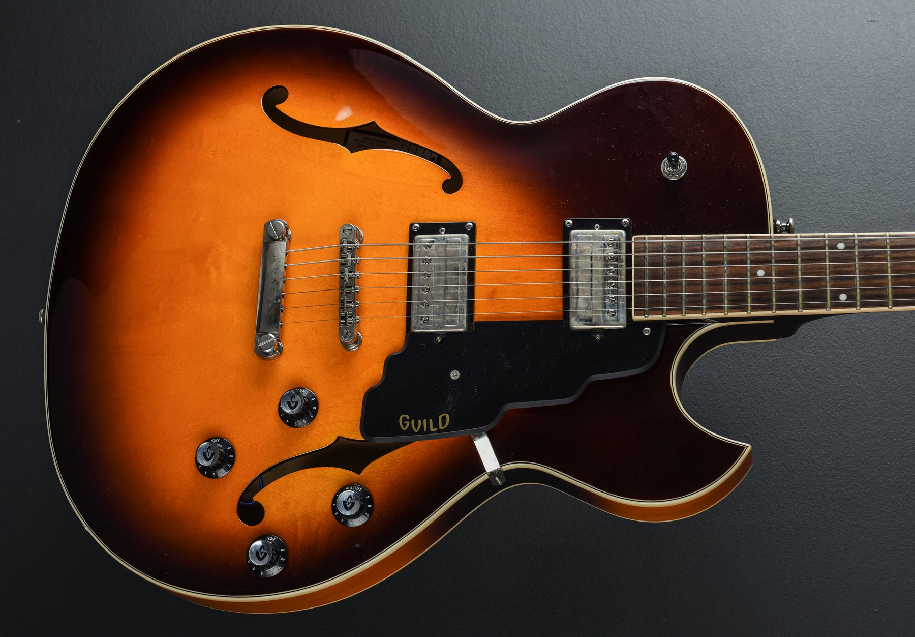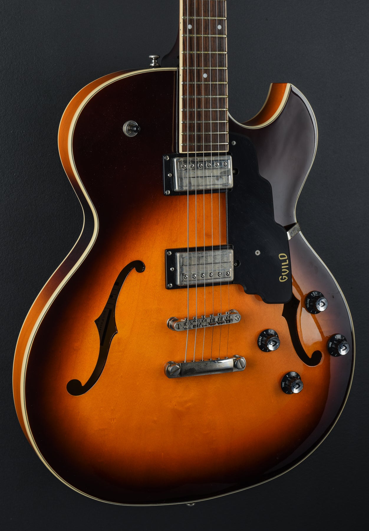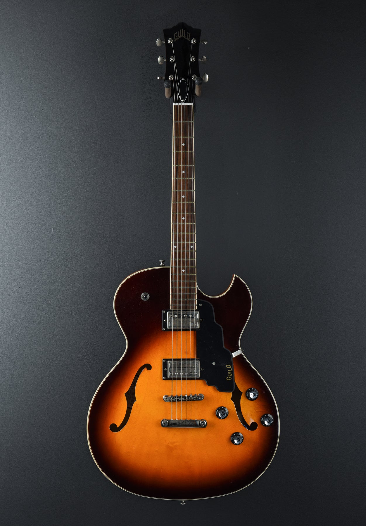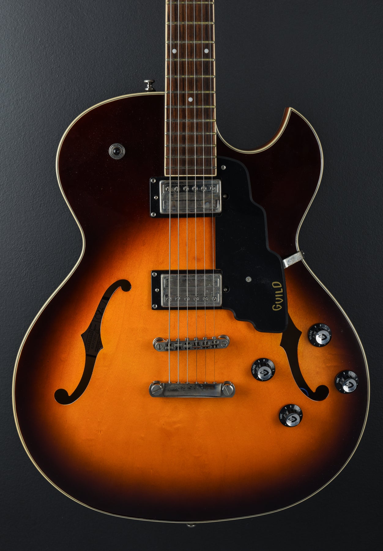 Very Good Condition, Antique Burst Gloss Polyurethane Finish, Semi-Hollowbody With Center Block For Bridge Stability And Reduced Feedback, Laminated Maple Top/Sides/Back, Unbound F-Holes, Set-In Mahogany Neck With Modern Thin “U” Profile, 24.75" Scale Length, 1 11/16" Nut Width, Indian Rosewood Fingerboard With 12.5" Radius And Pearloid Dot Inlays, 20 Narrow-Tall Frets, Nickel Hardware, Guild Tune-O-Matic Bridge And Stop-Bar Tailpiece, Guild Vintage-18 Open-Gear Tuners, Two Guild HB-2 Humbuckers With Push-Pull Coil Split On Volume And Tone Knobs, 3-Way Toggle Pickup Selector, 6.1lbs., Comes with a Hardshell Case.