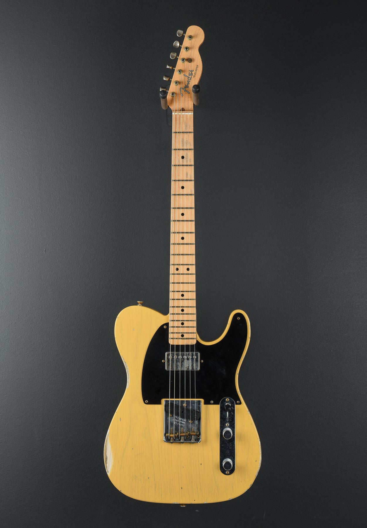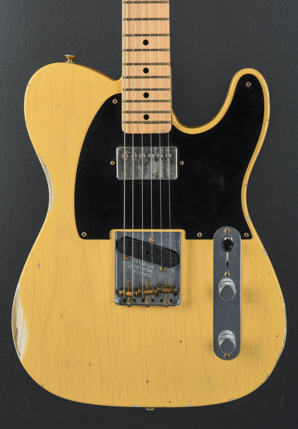 Nocaster Blonde, Ash body, 1954 U shaped Maple neck with a 9.5″ radius fingerboard and medium jumbo frets, 25.5" scale length, 1 5/8th" nut width, Relic Broadcaster bridge and Seymour Duncan ’59 humbucking neck pickups, 3-way switching with the modern wiring, The neck thickness is .91″ at the first and 1.00″ at the 12th frets, 7.0 pounds, With original hardshell case, Very Good