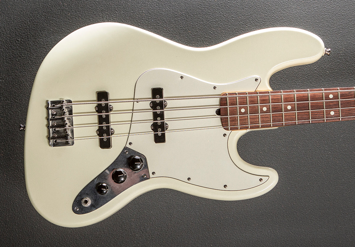 Olympic White, Gloss polyurethane body finish, Alder body, Modern C shaped neck with a 9.5" radius Rosewood fingerboard and medium jumbo frets, 34" scale length, 1.5" nut width, Fender standard single coil Jazz Bass bridge and neck pickups with the volume/volume/tone controls, String thru body bridge with the barrel steel saddles, Fender open gear tuners, The neck thickness is .80″ at the first and .95″ at the 12th frets, 9.4 pounds, With hardshell case, Very good