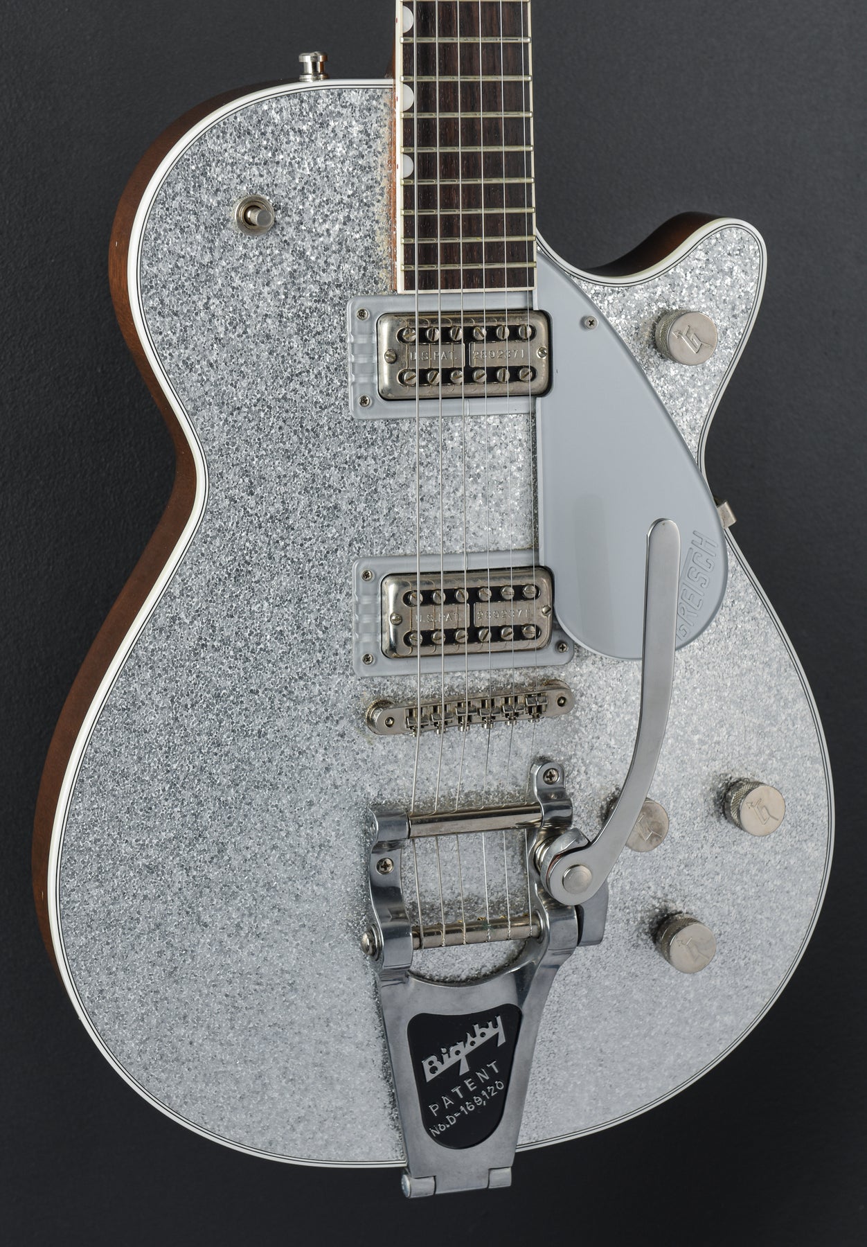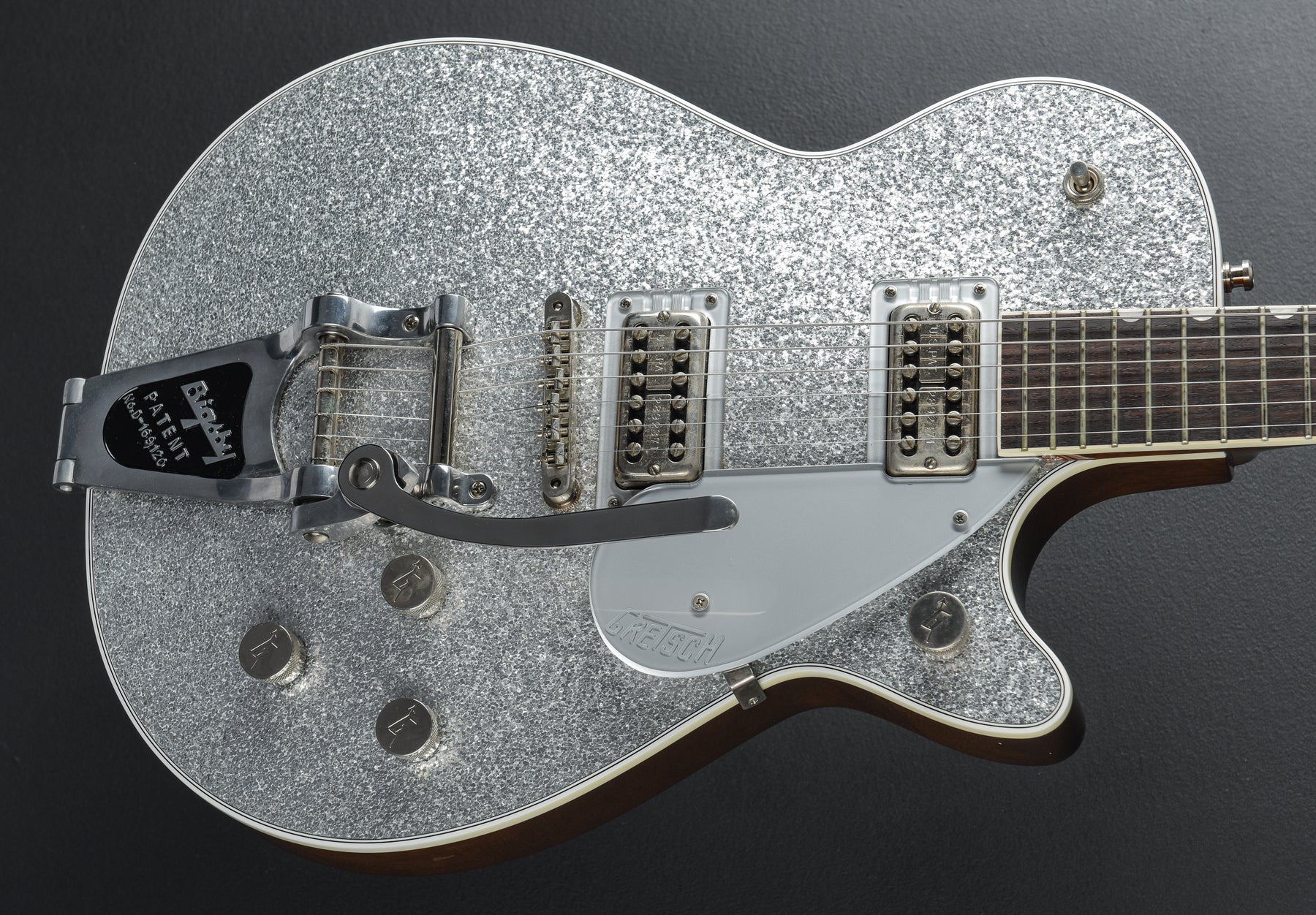 Very Good Condition, Silver Sparkle, Gloss Urethane Finish, Arched Laminated Maple Top on a Chambered Mahogany Body, Standard U Shaped Mahogany Neck, Bound 12" Radius Rosewood Fingerboard with Pearloid Neo-Classic Thumbnail Inlays and Medium Jumbo Frets, 24.6" Scale Length, 1.6875" Nut Width, High Sensitive Filter'Tron Bridge and Neck Pickups, 3-Way Toggle Switching with Master Volume and Tone Controls Plus a Volume Control for Each Pickup, Anchored Adjusto-Matic Bridge and a Bigsb B7CP String-Thru Vibrato, Gotoh Locking Tuners, 8.9 Pounds, With Gretsch Hardshell Case.