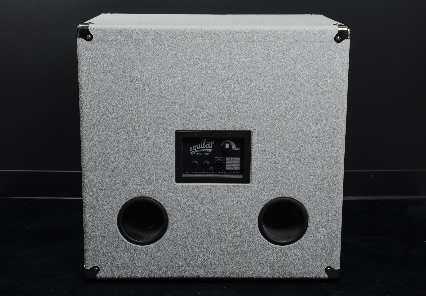 600-Watts, 4 Ohms, 2 x 12" speakers and phenolic tweeter with integral phase plug, Custom Eminence drivers; Aguilar's custom horn and crossover.